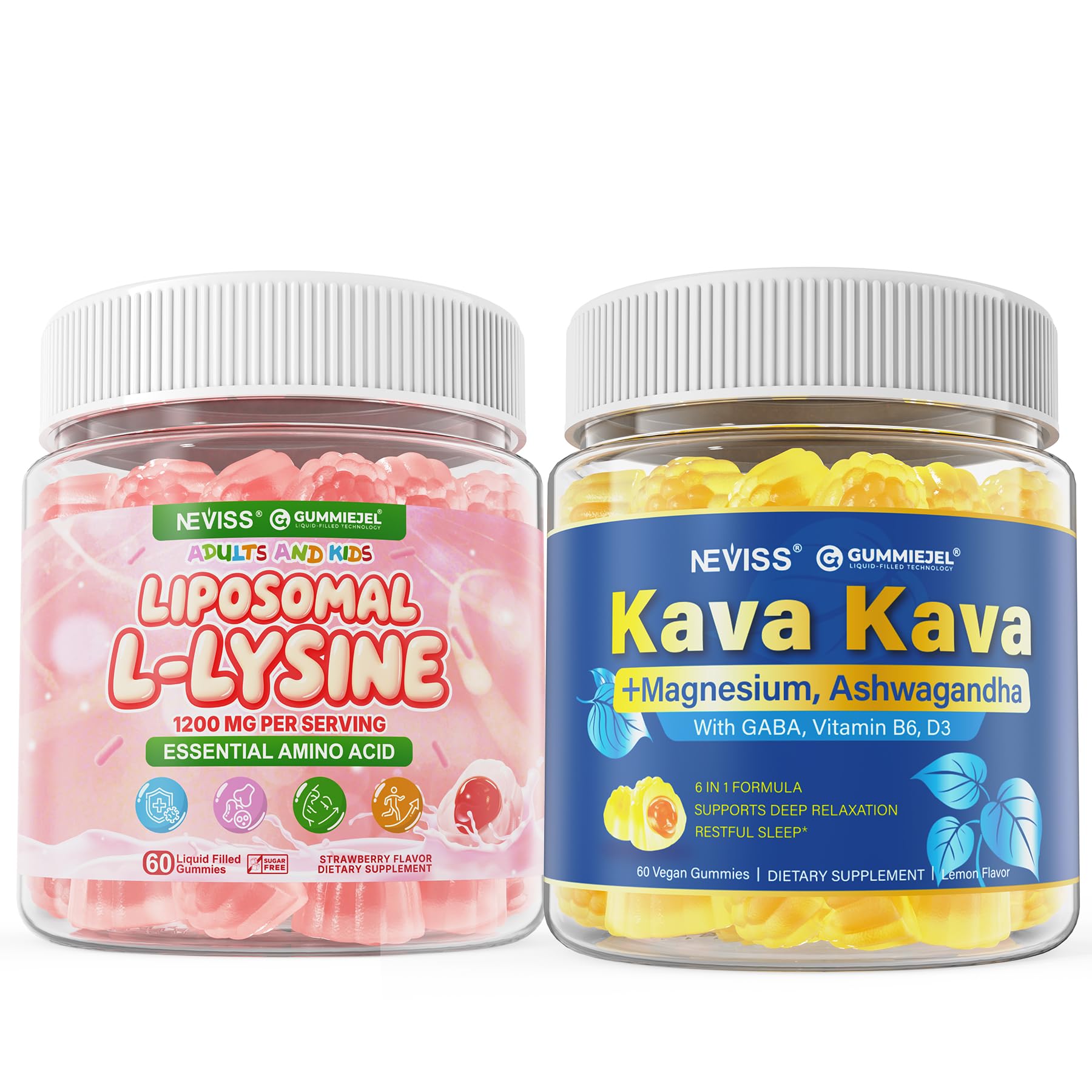 NEVISS Kava Kava Gummies for Calm + Liposomal L-Lysine Gummie 1200mg for Immune & Skin Support