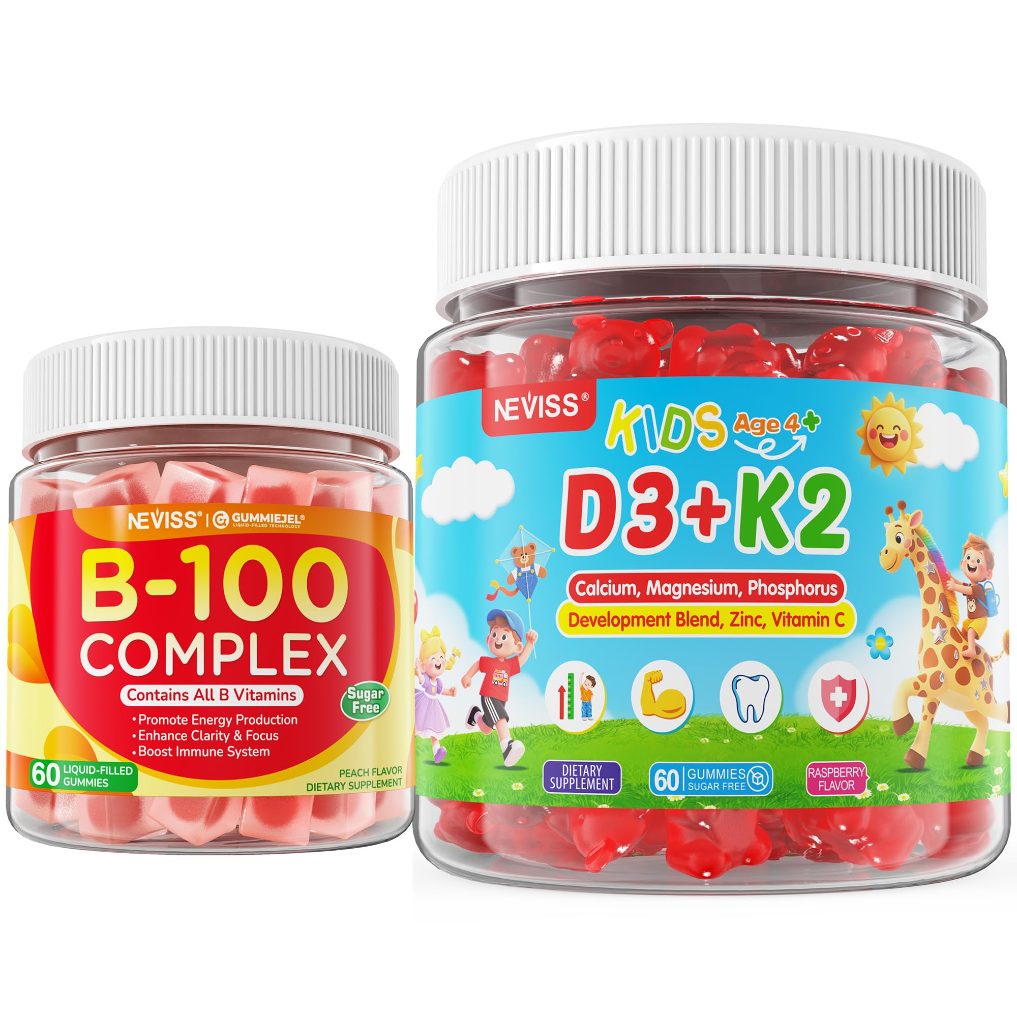 NEVISS Kids Vitamin D3 K2 Gummies 2 Pack + Super Vitamin B Complex Gummies 1 Pack