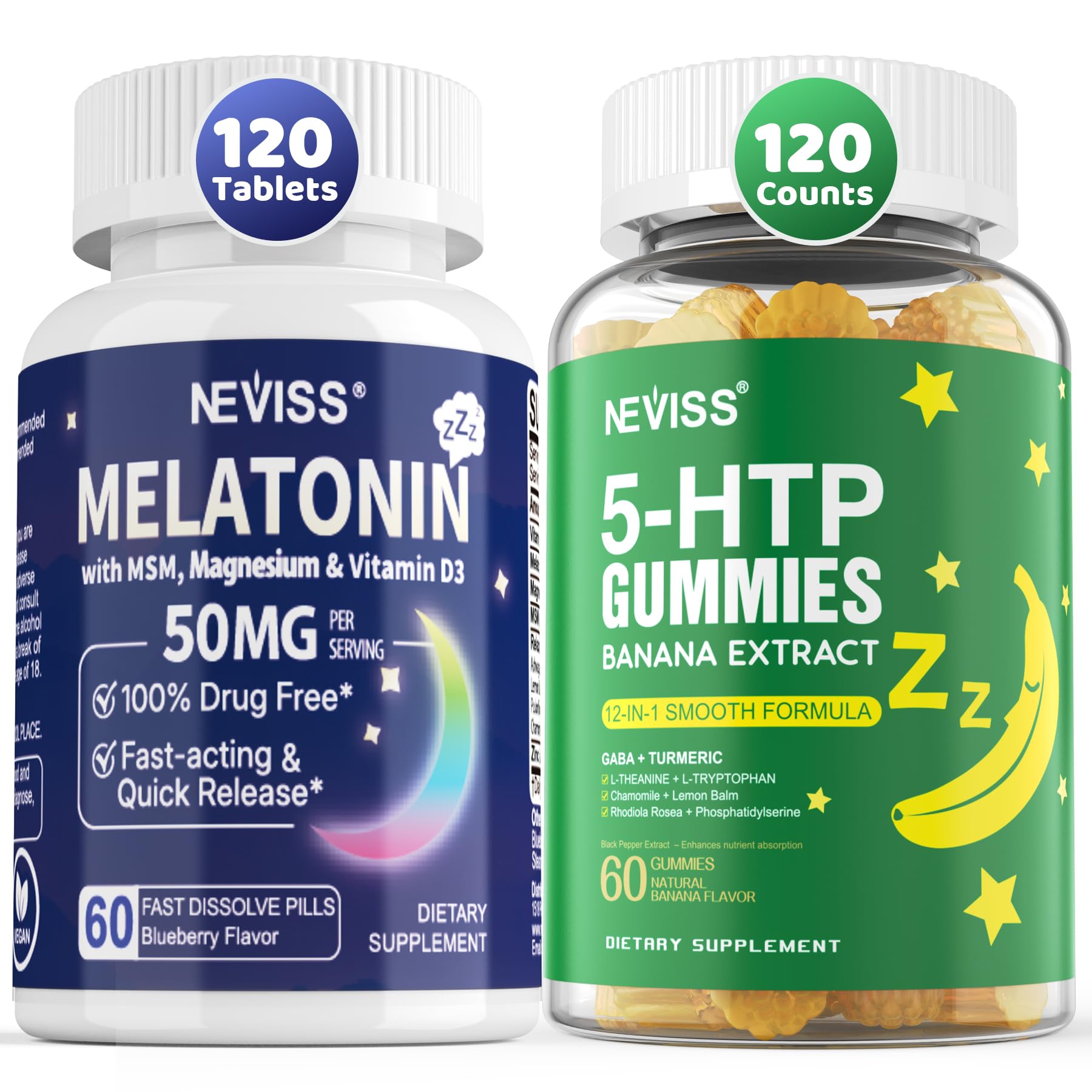 NEVISS Melatonin 50 mg for Adults - Extra Strength 9-in-1 Fast Dissolve Sublingual - High Dose with Magnesium Glycinate, Vitamin D3, Ashwagandha, Lemon Balm, Chamomile, Sugar Free,Vegan 120 Tablets 5-HTP Gummies GABA - Melatonin Free - Relaxation Gummies with Banana Extract, L-Theanine,L-Tryptophan, Vitamin D3 for Healthy Rest Cycle Circadian Rhythm, Brain Function Muscle Relax, Pack of 2