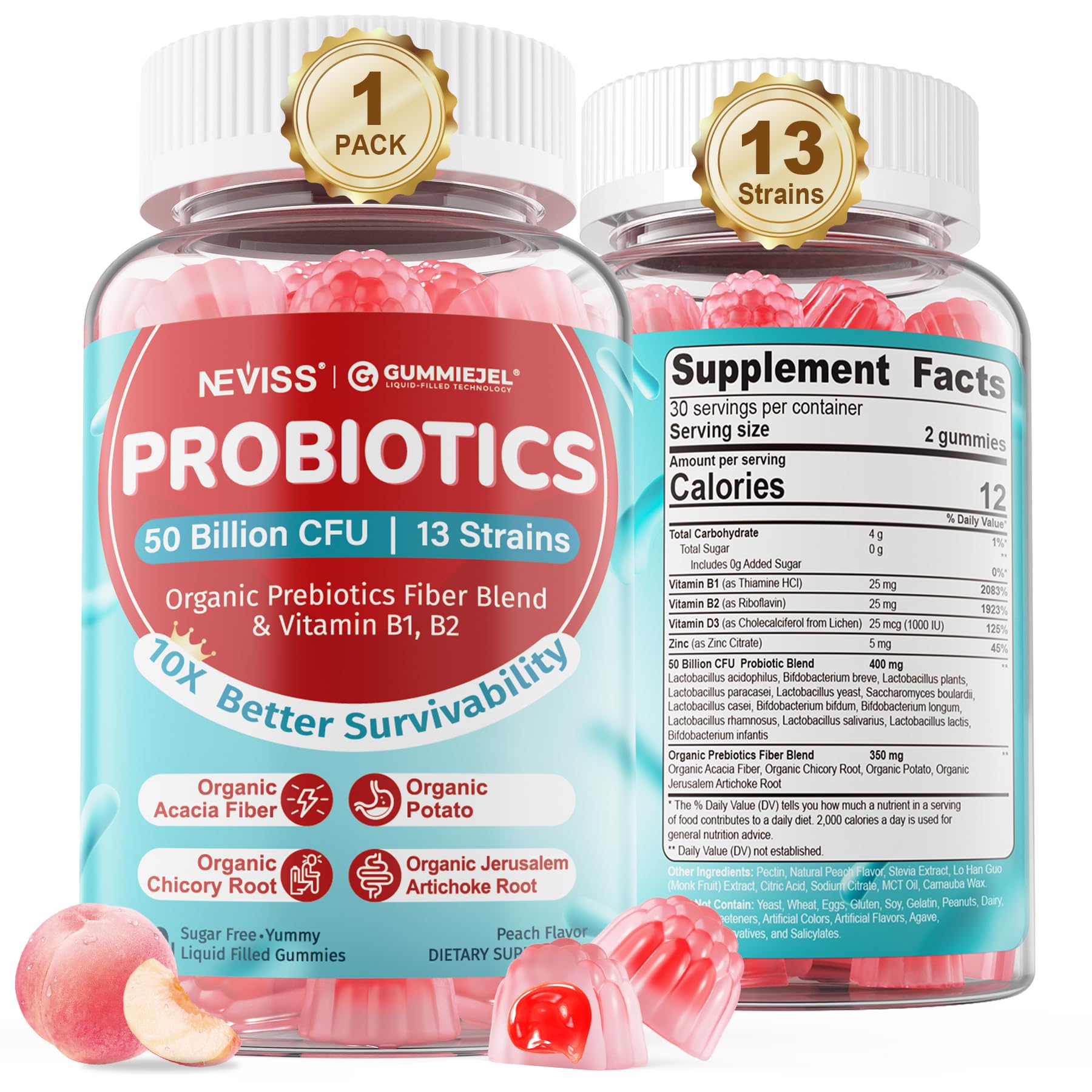 Sugar Free, Vegan Friendly: All womens probiotics and prebiotics chew are manufactured in a GMP-certified factory and strictly tested to ensure the ingredients are safe and pure. Take 2 gummies per day. The delicious peach flavor tastes great and is easy to chew. The gummies are gluten-free, soy-free, wheat yeast-free, 100 vegan and NON-GMO. 3rd-Party Tested. All proniotic prebiotic gummies are packed in a shelf-stable bottle, no refrigeration needed. Please feel free to contact us with any questions. Gut Health Immune Health: Vitamin D3, and zinc are tried-and-true immune superstars to help stimulate immune cell production. Our women's probiotics, contain 25mg Vitamin B1 and Vitamin B2 to support nutrient absorption, aid in the conversion of food into energy, supports a healthy gut. Our probiotics for men gummies are packed with ZERO sugar thanks to the natural sweetness of Lo Han Guo (Monk Fruit), allowing you to indulge without the guilt. No added sugar, 0g carbs, and vegan-friendly!. Happy Tummy, Happy Life: Prebiotics - they are nutrients for probiotics, which promote digestive system health by stimulating the growth of probiotics. Our prebiotics and probiotics for women carefully formulated Acacia Fiber, Organic Chicory Root, Potato, and Jerusalem Artichoke Root to help chase away hunger and eat less, support regular bowel cleansing, and help you reach your goals faster. 6-in-1 probiotic gummies not only support immune health but also help you feel happy, energetic vibrant. Prebiotics and Probiotics for Digestive Health: Probiotic gummeis for women contain 13 strains that support digestive health, and work together to ease bloating, diarrhea, constipation, and indigestion, among them, Bacillus coagulans and Bacillus subtilis have super acid resistance. Prebiotics are nutrients for probiotics, which promote digestive system health by stimulating the growth of probiotics. Bloating relief for women with 350 mg of prebiotics fiber are naturally extracted, so they will be more effective. 10 X Higher Probiotic Survival Rate: Our probiotic gummies featured a chewy outer layer and a natural peach-flavored filling. The inner Liquid-filled layer locks in prebiotic and probiotic, while the protective pectin layer stabilizes and preserves their efficacy. This dual-layer approach enhances absorption, giving you the vibrant energy and vitality. GUMMIEJEL technology ensures that 98 of the probiotic bacteria reach the intestine alive, compared to an average of 7 on the market.