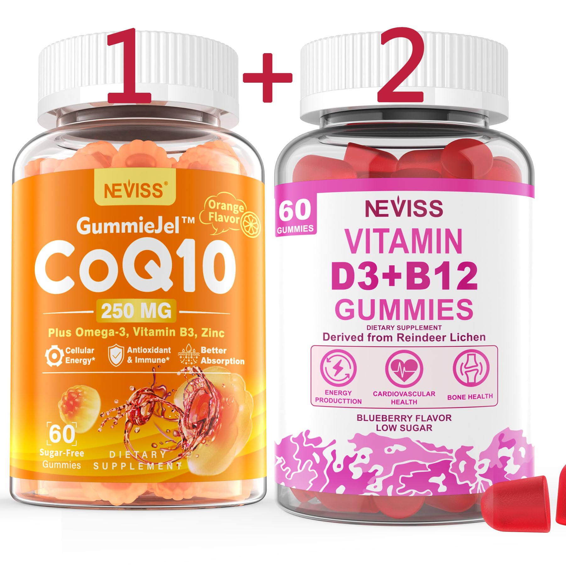 NEVISS Sugar-Free CoQ10-250mg Filled Gummies 60Cts + Vegan Vitamin D3 5000IU & Methyl B12 1000mcg Gummies 120Cts