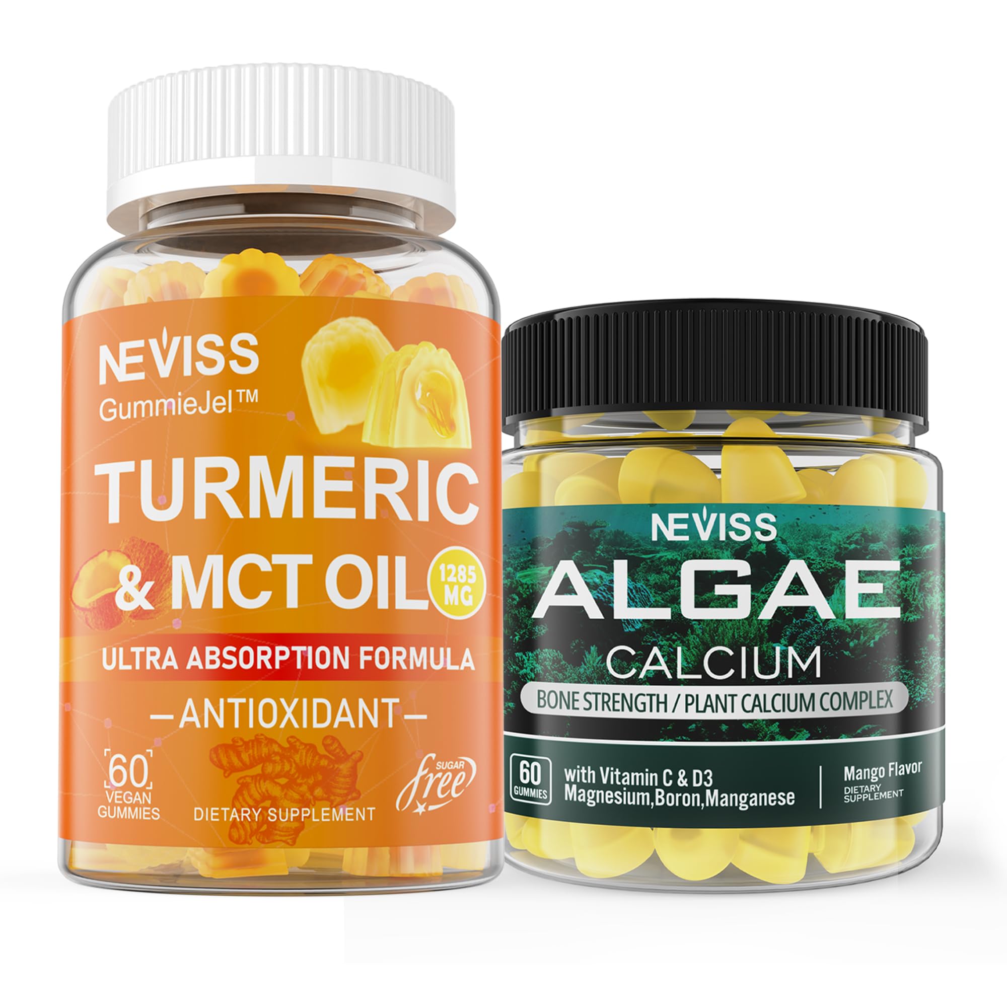 NEVISS Sugar Free Turmeric Curcumin Gummies + Marine Algae Calcium Supplement 600mg High Absorption Vegan