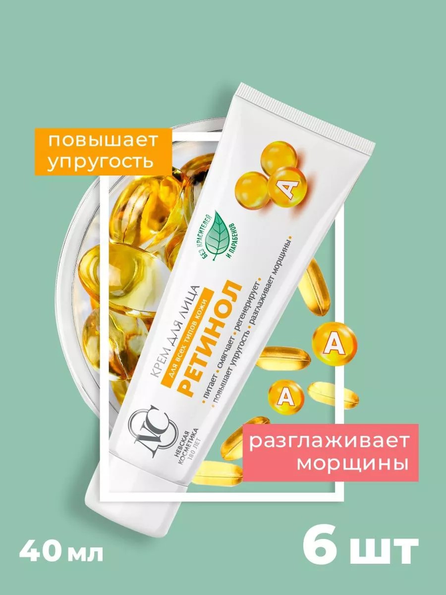 Nevskaya Cosmetics Retinol Face Cream. Suitable for all skin types. Improves elasticity and smoothes fine wrinkles. Contains a rich blend of active ingredients. Vitamins A, E, and F accelerate metabolism, stimulate cell renewal, provide a protective effect, provide smoothness, promote hydration, nourishment, and enhance regeneration. Olive oil intensely moisturizes, softens, and nourishes. The product is quickly absorbed without a sticky or greasy feeling, eliminating flaking and dryness. Package includes: 6 packages.