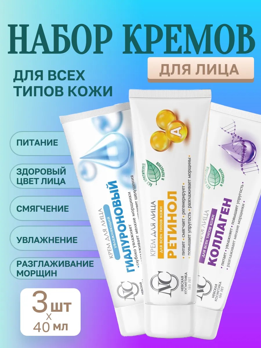 The Nevskaya Cosmetics face cream set is designed for comprehensive skin care. Retinol Moisturizing Face Cream accelerates cell renewal, prevents photoaging and wrinkles, heals inflammation, and evens out skin tone. Retinol Cream is suitable as a night cream in summer and a day cream in winter. Retinol Moisturizing Face Cream protects skin from chapping and heals inflammation and irritation. Collagen Cream rejuvenates, maintains skin tone and elasticity, and protects against negative external factors, helping to preserve youthful skin. Collagen Cream is suitable for daily use. People often need a face cream for oily skin, as well as a Hyaluronic Acid moisturizer with hyaluronic acid, which deeply hydrates, smoothes wrinkles, provides a lifting effect, and gives skin a healthy glow. This face cosmetic set is just that. Hyaluronic Acid Facial Moisturizing Cream provides anti-aging benefits and is suitable for daily use during the summer months when the sun is strong, as well as for dry, flaky skin. This facial care set provides comprehensive daily care for beautiful, youthful, and healthy skin.