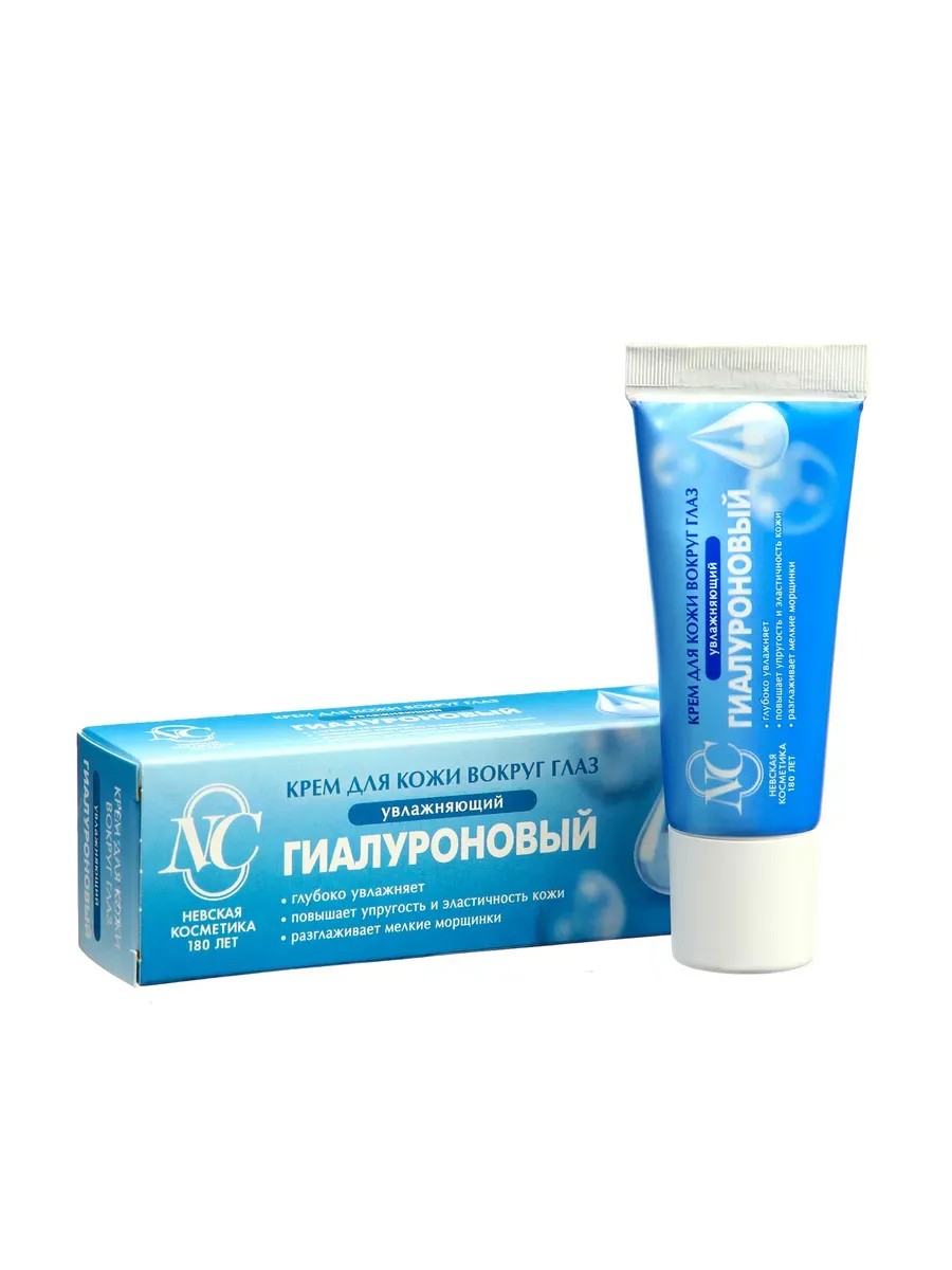 Крем для кожи вокруг глаз Гиалуроновый Невская косметика. Состав обогащен питательными компонентами. Гиалуроновая кислота проникает в глубокие слои эпидермиса, увлажняет, питает изнутри, стимулирует синтез коллагена и эластина, подтягивает, сокращает количество мелких морщин, ускоряет заживление и восстановление после повреждений. Витамин А усиливает обменные процессы в клетках, способствует обновлению клеток, снимает шелушение и излишнюю сухость, улучшает структуру, обеспечивает гладкость и увеличивает ее способность удерживать влагу. Не содержит красителей и парабенов.