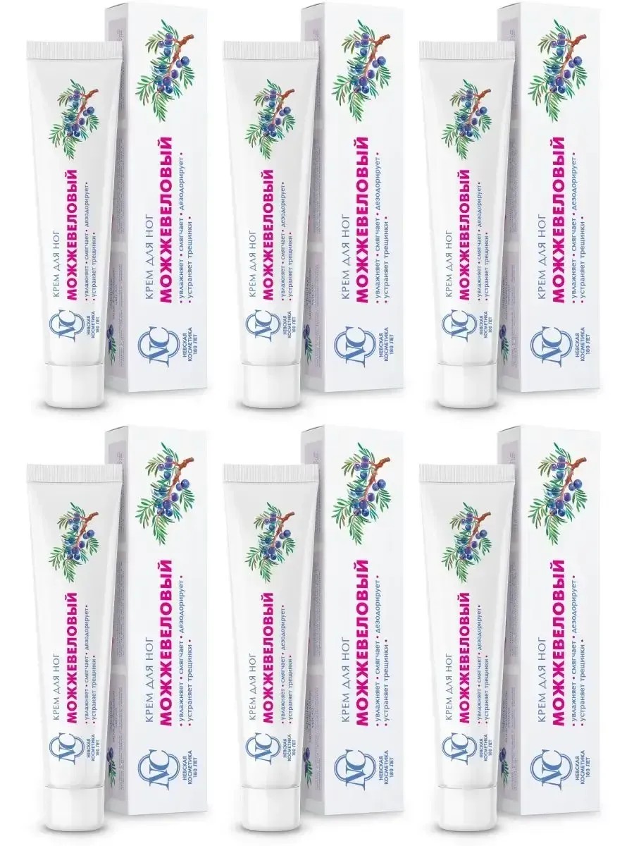 Невская Косметика, Крем для ног Можжевеловый, 50 мл. Питает, увлажняет, освежает, регенерирует и смягчает натоптыши.Крем предназначен для ежедневного ухода за кожей ног. Он быстро впитывается и отлично смягчает загрубевшую кожу. В результате применения крема кожа ног становится мягкой, гладкой и ухоженной, в ногах появляется ощущение легкости, свежести и комфорта. Эфирное можжевеловое масло усиливает кровообращение, стимулирует обменные процессы в коже (вспомните целительные можжевеловые веники), придает ощущение свежести уставшим ногам. Глицерин - один из самых эффективных натуральных увлажнителей.Аллантоин успокаивает кожу, оказывает смягчающее и увлажняющее действие. В комплекте 6 упаковок по 50 мл.