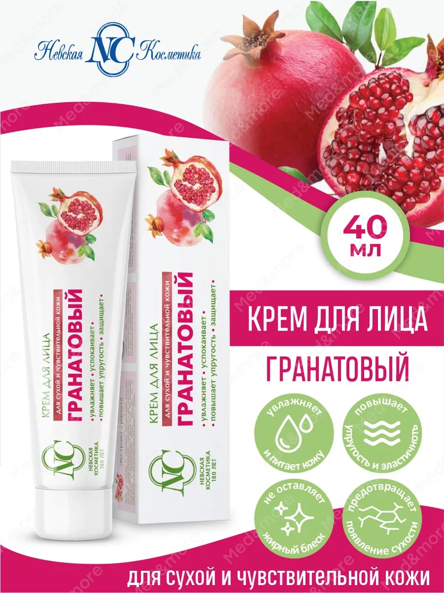 Nevskaya Cosmetics Pomegranate Face Cream 40 ml is a universal daily care product for all skin types, created with the needs of modern skin in mind. Its rich formula provides a comprehensive effect: deeply moisturizes, soothes, and softens the skin, preventing dryness and discomfort.