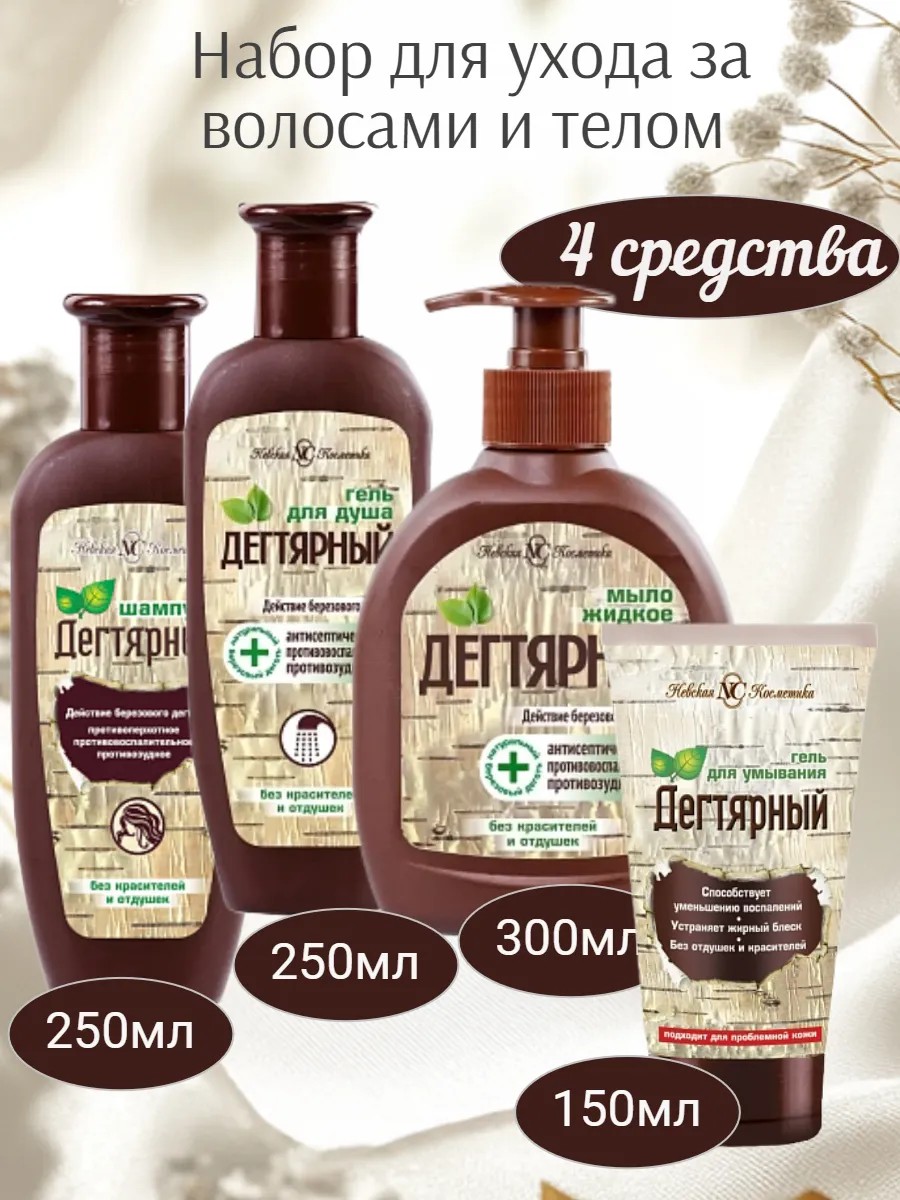 Гель для душа Невская Косметика Дегтярный предназначен для ежедневного очищения кожи тела. Бережно очищает кожу, не вызывая раздражения. Шампунь Невская Косметика Дегтярный бережно очищает волосы и кожу головы, не вызывая раздражения. Улучшает общее состояние волос и кожи головы, возвращает волосам блеск. Кондиционирующая добавка - облегчает расчесывание волос, придает объем, делает волосы более послушными и мягкими. Средства не содержат искусственных отдушек и красителей, парабенов, силиконов, полиэтиленгликолей. Натуральный березовый деготь — обладает антисептическим, противовоспалительным и противозудным действием. Придает продуктам натуральный коричневый цвет и ярко выраженный насыщенный аромат. Жидкое мыло Невская Косметика Дегтярное предназначено мытья и рук и тела, в том числе проблемной кожи. Бережно очищает кожу, не вызывая раздражения. Можно использовать в качестве геля для душа. Гель для умывания предназначен для очищения проблемной кожи лица. Гель эффективно очищает кожу, борется с несовершенствами, устраняет жирный блеск, успокаивает. Не содержит искусственных отдушек и красителей, силиконов и парабенов.