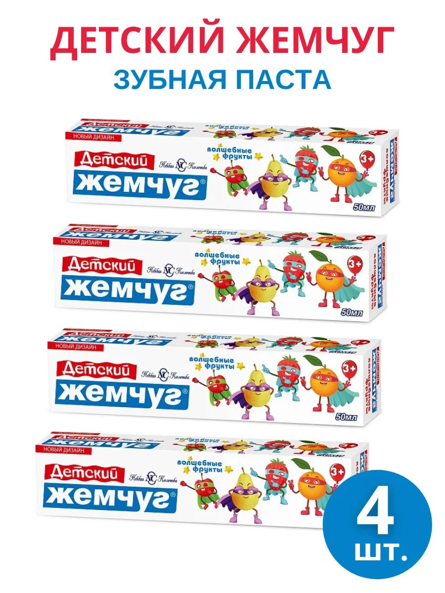 В набор входит: зубная паста Новый Жемчуг детская Волшебные фрукты 4 штуки по 50мл.