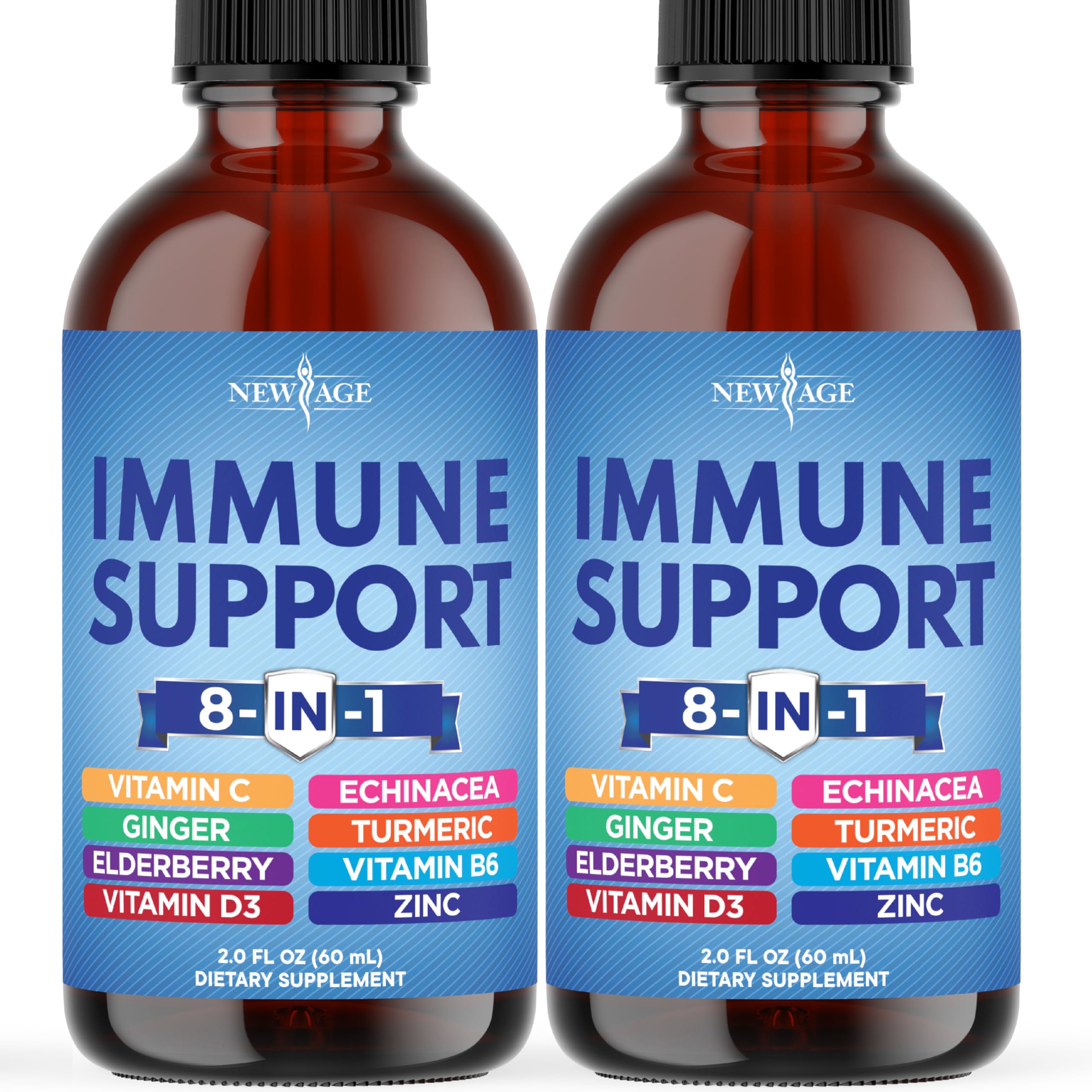 NEW AGE 8-in-1 Immune Support Liquid Drops Elderberry Turmeric Curcumin Echinacea Ginger Vitamins C & D3 Zinc & B6 Fast-Absorbing Immune & Antioxidant Support Vegan Non-GMO 4 oz 2 Fl Oz (Pack of 2)