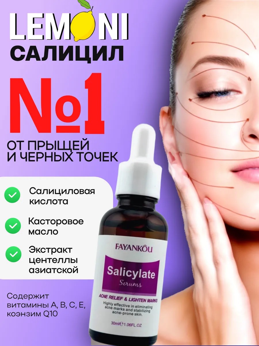 Салициловая кислота является одним из самых эффективных компонентов в борьбе с прыщами и акне. Проникая в структуры кожи салициловая кислота устраняет воспаление тканей, сужает поры, разглаживает кожу. Сыворотка от прыщей с салициловой кислотой, цинком и касторовым маслом при регулярном использовании помогает полностью избавится от проблемы прыщей и акне. Салициловая кислота способствует мягкому отшелушиванию ороговевших клеток кожи, а также очищает поры и предотвращает образование черных точек.