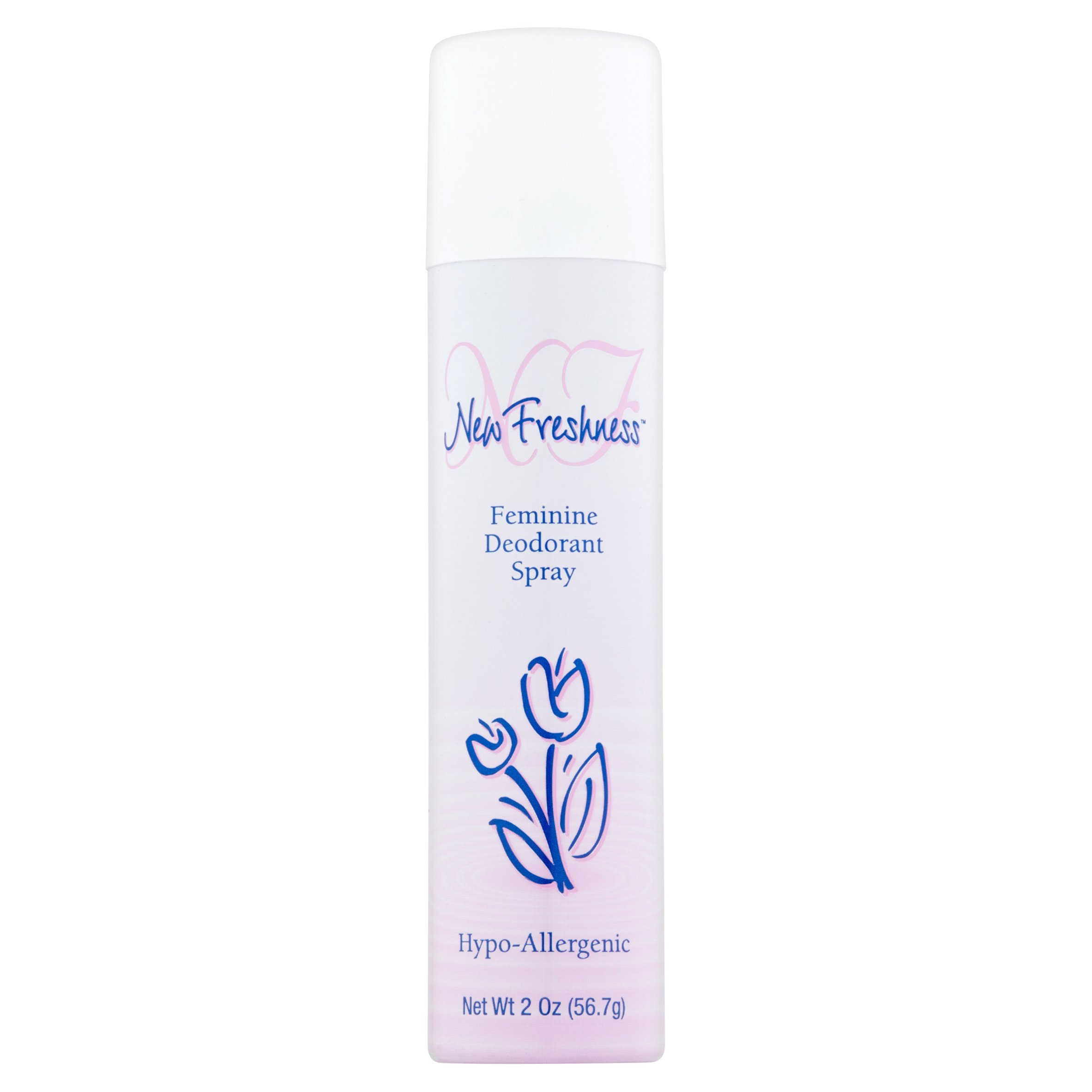 Specially formulated to control odor. New freshness deodorant spray contains baking soda and corn starch to absorb odor and moisture. It's hypo-allergenic, so it's safe and gentle enough for everyday use. New Freshness Feminine Deodorant Spray 2 Oz Aerosol Can