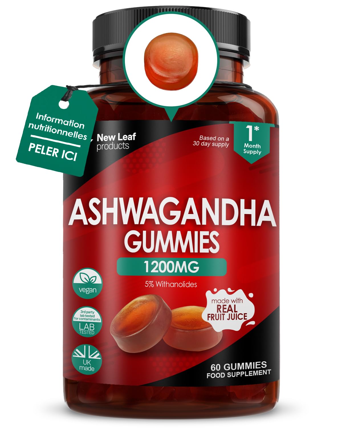 New Leaf Ashwagandha en Gummies 1 200 mg, Gummies d'Extrait de Racine d'Ashwagandha Pur, avec 5 de Withanolides, Jus de Fruit, sans Colorants ni Arômes Artificiels, Végans, sans Gluten, 60 Unités