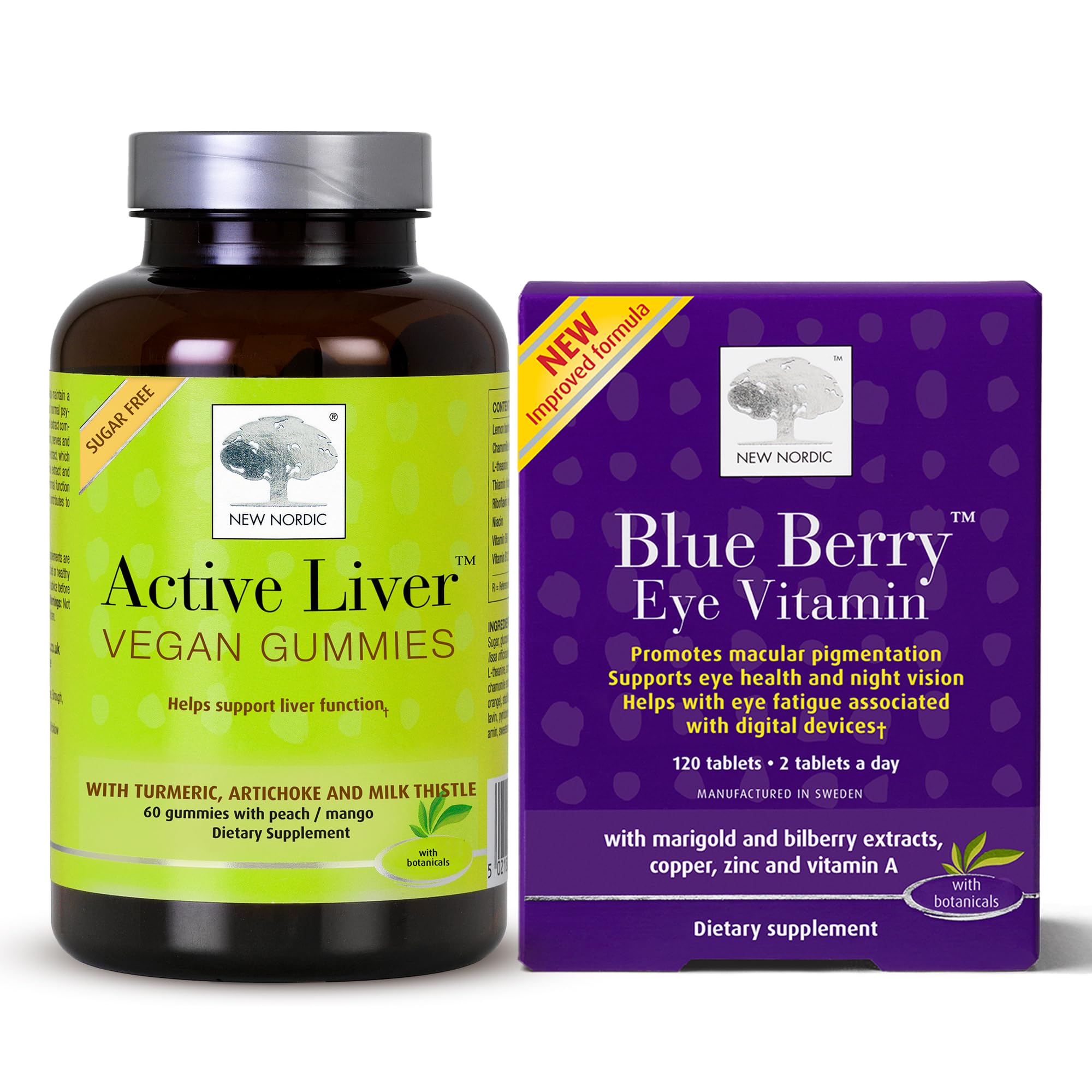 New Nordic Active Liver Gummies are a tasty, sugar free way to support your liver daily. 3 gummies will provide you with the exact same content of the herbal ingredients as 1 tablet of Active Liver, but in a must more desirable peach mango flavoured gummy. The gummies, which are manufactured in Sweden, contain artichoke, milk thistle, and turmeric, which help support liver functions daily. Milk thistle has its origins in the Mediterranean area. Packed with flavonoids, it has been used as a herbal liver tonic for centuries. Turmeric is the most commonly used herb to support liver. Globe artichoke leaves further support normal liver function. New Nordic's herbal supplements are made in Scandinavia where people live close to nature, seeking it as a source of vitality. Our herbal experts and researchers use naturally sourced ingredients and potent plant-based extracts in our herbal supplements to help you thrive without compromising your overall health. The New Nordic Blueberry Strong Eye Vitamin tablets (Blue Berry Strong) contain European blueberry (bilberry) extract and marigold extract. These highly concentrated blueberry tablets have a high content of anthocyanins, a deep purple pigment, and natural lutein. Lutein is a pigment that is naturally found in dark green leafy vegetables. New Nordic's herbal supplements are made in Scandinavia where people live close to nature, seeking it as a source of vitality. Our herbal experts and researchers use naturally sourced ingredients and potent plant-based extracts in our herbal supplements to help you thrive without compromising your overall health. These statements have not been evaluated by the Food and Drug Administration. This product is not intended to diagnose, treat, cure, or prevent any disease.PURE INGREDIENTS - Vegan, non-GMO, formulated without preservatives, artificial flavors, or colors, and free from salt, gluten, yeast, soy and dairy. NATURALLY SOURCED - Globe artichoke, milk thistle, and turmeric curcumin support a normally functioning liver system and processes, normal digestion and normal immune system function for men and women. DAILY LIVER SUPPORT - A delicious and sugar free way to support your normal liver processes every day. Adults 18 take 2-3 natural peach mango flavored gummies for ongoing support. RICH BILBERRY LUTEIN – Packed with potent European blueberry (bilberry) and lutein standardized marigold extract with vitamins A and E supports normally functioning eyesight . EYE HEALTH SUPPORT - 2 daily tablets help support and maintain healthy eyes and vision while helping increase levels of macular pigmentation to maintain normal eyesight .