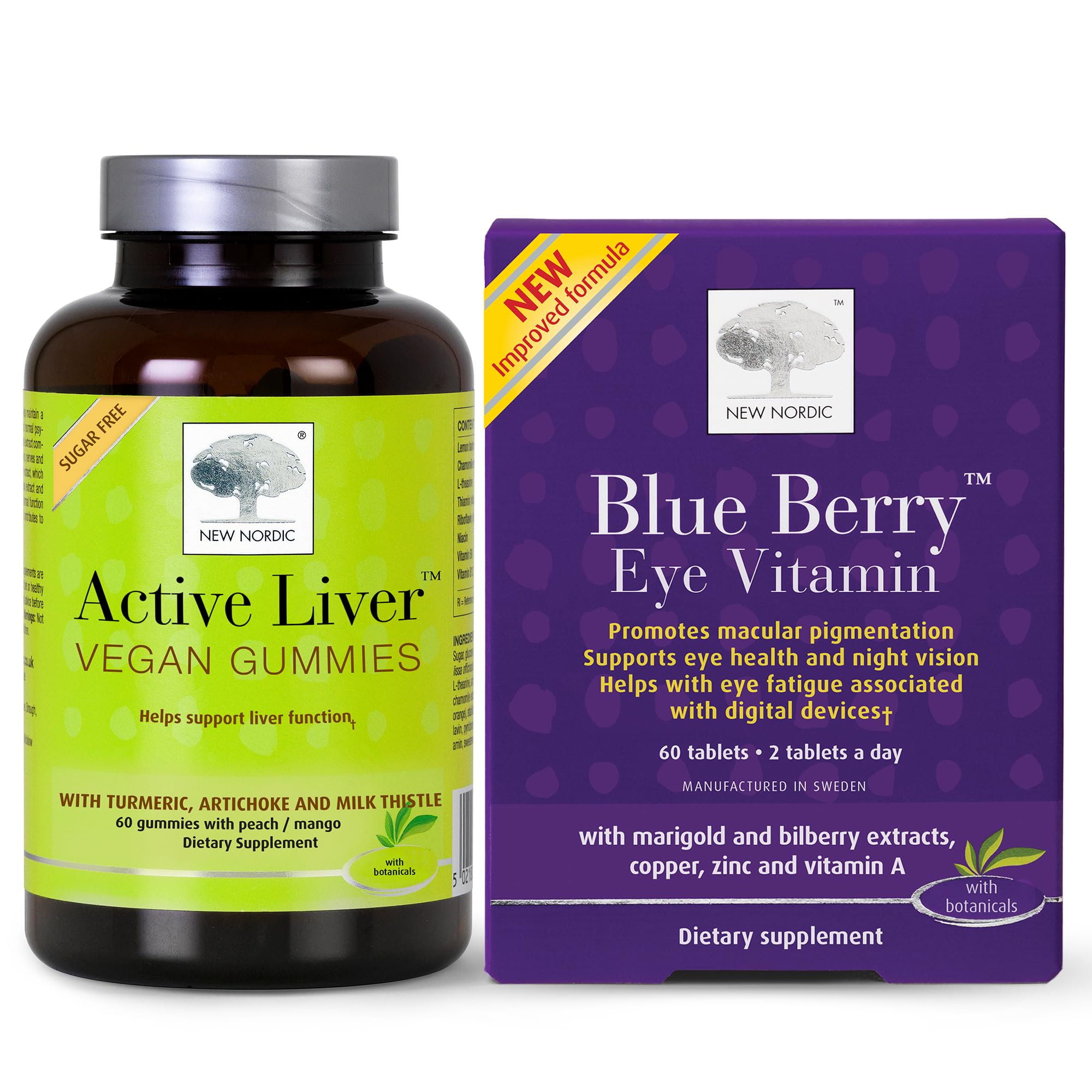 New Nordic Active Liver Gummies are a tasty, sugar free way to support your liver daily. 3 gummies will provide you with the exact same content of the herbal ingredients as 1 tablet of Active Liver, but in a must more desirable peach mango flavoured gummy. The gummies, which are manufactured in Sweden, contain artichoke, milk thistle, and turmeric, which help support liver functions daily. Milk thistle has its origins in the Mediterranean area. Packed with flavonoids, it has been used as a herbal liver tonic for centuries. Turmeric is the most commonly used herb to support liver. Globe artichoke leaves further support normal liver function. New Nordic's herbal supplements are made in Scandinavia where people live close to nature, seeking it as a source of vitality. Our herbal experts and researchers use naturally sourced ingredients and potent plant-based extracts in our herbal supplements to help you thrive without compromising your overall health. The New Nordic Blueberry Strong Eye Vitamin tablets (Blue Berry Strong) contain European blueberry (bilberry) extract and marigold extract. These highly concentrated blueberry tablets have a high content of anthocyanins, a deep purple pigment, and natural lutein. Lutein is a pigment that is naturally found in dark green leafy vegetables. New Nordic's herbal supplements are made in Scandinavia where people live close to nature, seeking it as a source of vitality. Our herbal experts and researchers use naturally sourced ingredients and potent plant-based extracts in our herbal supplements to help you thrive without compromising your overall health. These statements have not been evaluated by the Food and Drug Administration. This product is not intended to diagnose, treat, cure, or prevent any disease.SCANDINAVIAN MADE - Taking the best of traditional medicine and biological science, we source high quality, pure ingredients to create supplements that work with your body's natural systems for healthier, more sustainable results. PURE INGREDIENTS - Vegan, non-GMO, formulated without preservatives, artificial flavors, or dye colors, and free from sugar, salt, gluten, yeast, soy and dairy. EYE HEALTH SUPPORT - 2 daily tablets help support and maintain healthy eyes and vision while helping increase levels of macular pigmentation to maintain normal eyesight . DAILY LIVER GUMMY - Globe artichoke extract, milk thistle extract, and turmeric packed in a delicious and sugar free gummy to support your normal liver processes every day. Adults 18 take 2-3 natural peach mango flavored gummies for ongoing support.