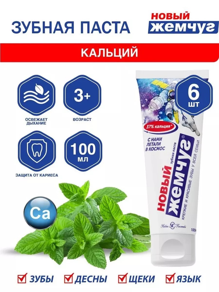 Зубная паста Новый жемчуг: Кальций укрепляет твёрдые ткани полости рта. А ещё: защищает зубы от кариеса;