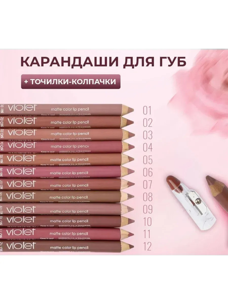 Набор карандашей для губ Violet 12 штук + точилки-колпачки — идеальный выбор для тех, кто ищет стойкие и матовые карандаши для губ. В набор входят 12 разных оттенков: от нюдовых и пудровых до насыщенных винных — всё, что нужно для дневного и вечернего макияжа.