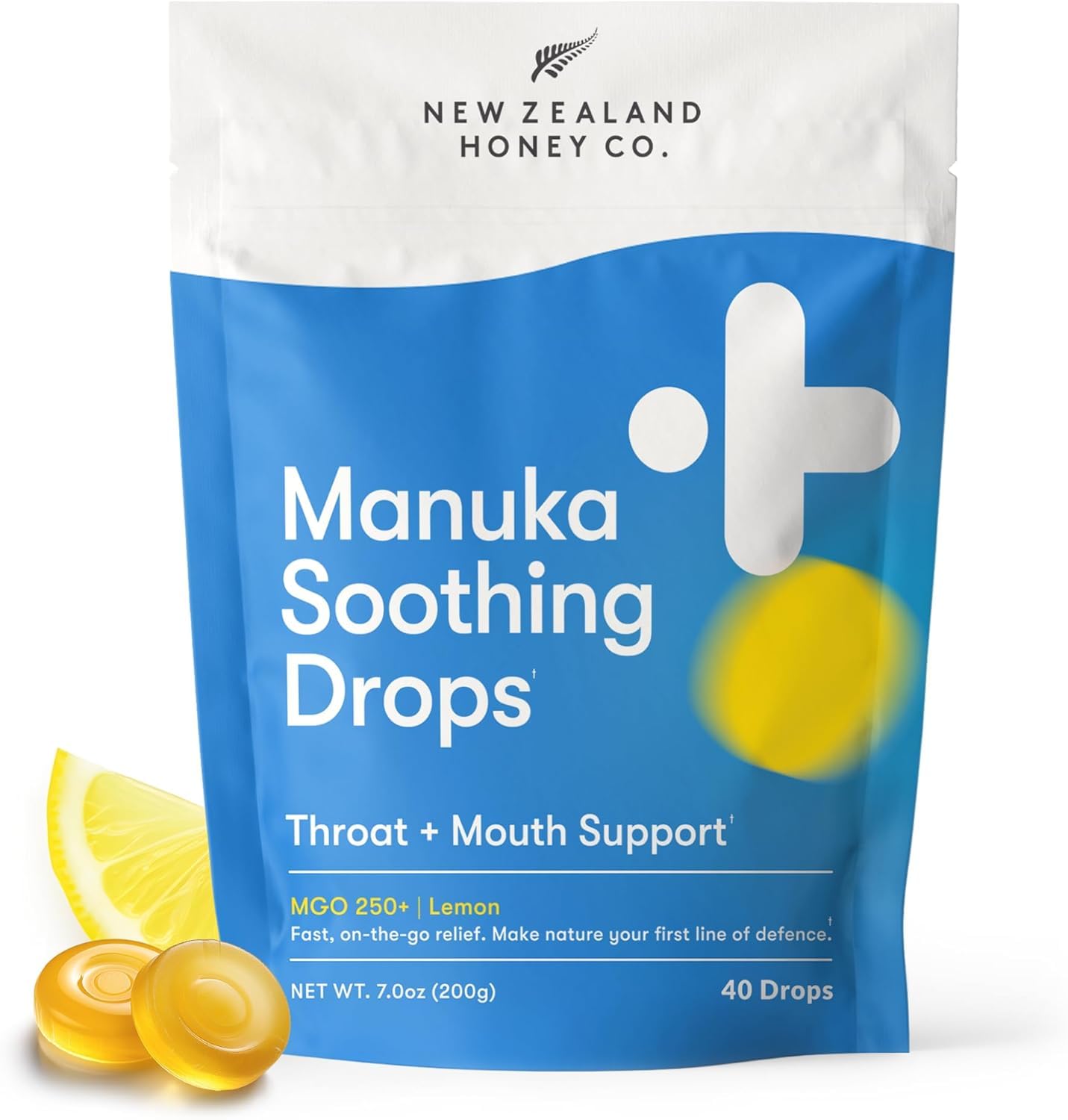 THE DETAILS– Each Manuka Soothing Drop is gluten-free, GMO-free, 100 natural, and free from artificial colours and flavours. These statements have not been evaluated by the Food and Drug Administration. This product is not intended to diagnose, treat, cure, or prevent disease. NEW ZEALAND MANUKA HONEY – New Zealand Honey Co. Manuka Soothing Drops are delicious throat drops made with real MGO 250 Manuka honey from New Zealand. THE POWER DUO - Partner Manuka Soothing Drop throat lozenges with your daily dose of New Zealand Honey Co. Manuka honey to promote immunity all year round. ON-THE-GO CONVENIENCE - Each MGO 250 Manuka Soothing Drop is individually wrapped for on-the-go convenience. It's the soothing relief of Manuka honey you can take anywhere. RELIEF THAT LASTS - Delicious, soothing lozenges for sore throats and dry mouths. MGO 250 Manuka honey coats the throat to help calm and soothe for relief that lasts. It's nature-powered care on the go. MANUKA SOOTHING DROPS - Make nature your first line of defence with our Manuka Soothing Drops with a squeeze of lemon. Delicious throat lozenges, supercharged with the benefits of pure New Zealand Manuka honey for fast relief.