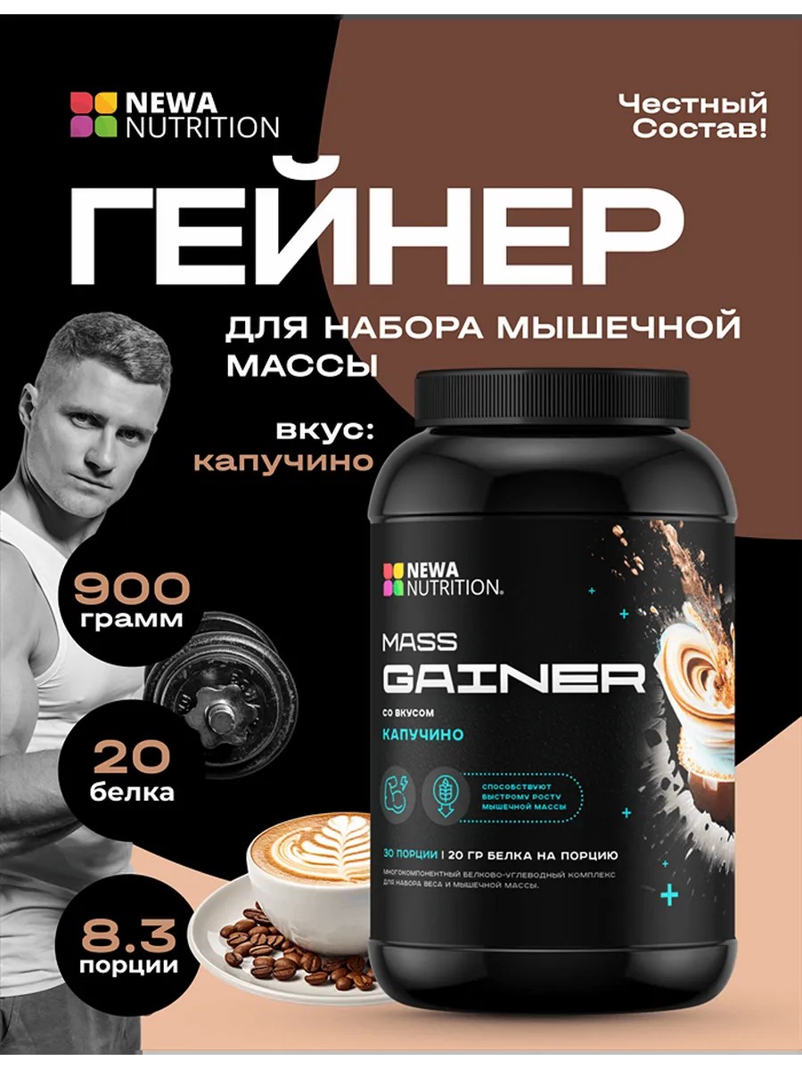 Гейнер - это многокомпонентный белково-углеводный комплекс для набора веса и мышечной массы. Полноценная и сбалансированная формула «NEWA Gainer» сочетает в себе мощную протеиновую матрицу в наборе с ключевыми питательными веществами анаболического действия, которые способствуют быстрому росту мышечной массы. Сочетание большого количества полноценного сывороточного белка с разнообразными короткоцепочечными и длинноцепочечными углеводами обеспечивает организм широким спектром аминокислот и питательных веществ. Добавив к своему ежедневному рациону и тренировкам прием «NEWA Gainer» вы можете удвоить прирост мышечной массы и улучшить силовые показатели.