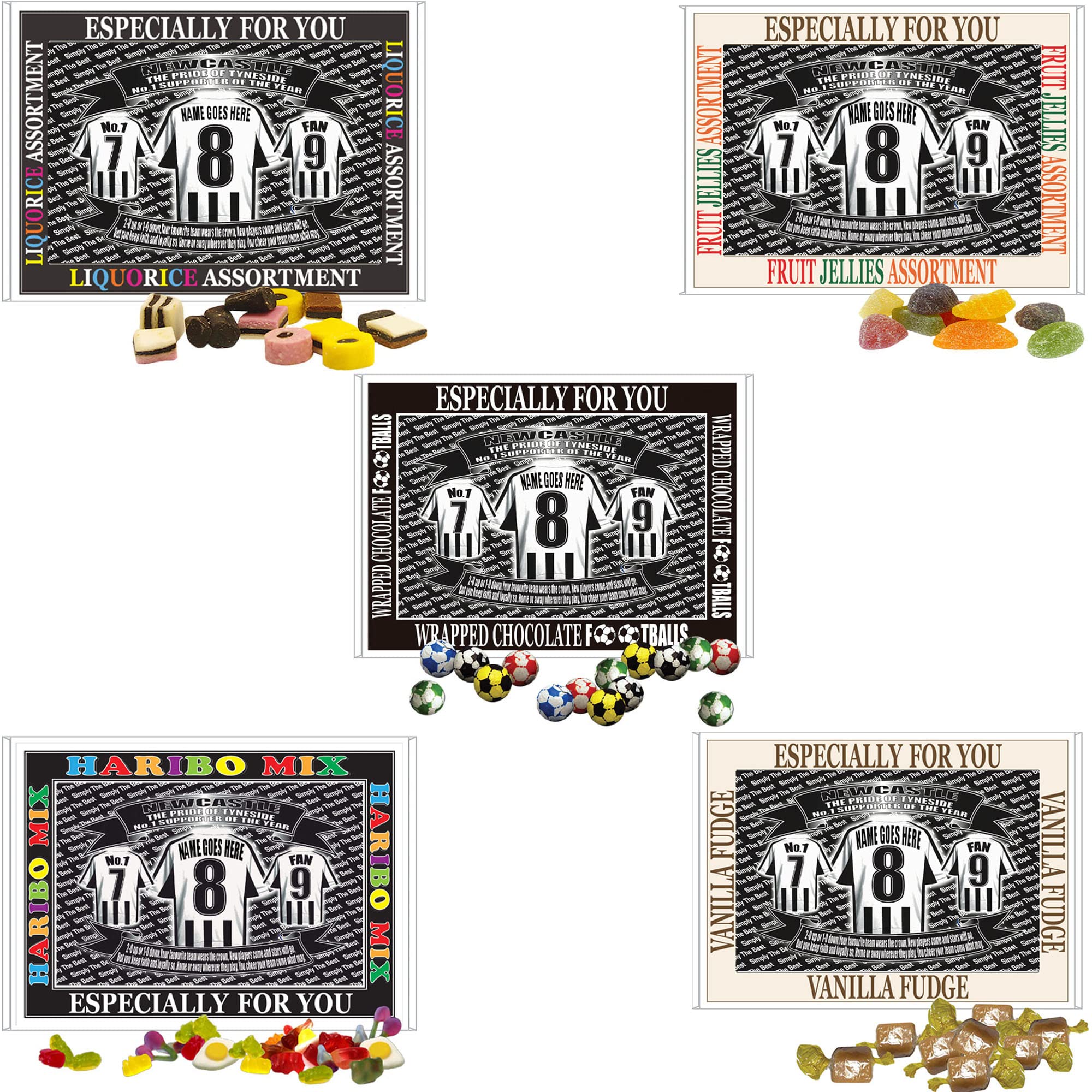 A perfect gift for any avid MAGPIES FAN. Your favourite football team's shirt image printed onto a box lid containing 200g of your favourite sweets. To make this extra special, you can have a FREE Personalised name added to the box. Ingredients: LIQUORICE ASSORTMENT: Sugar, treacle, wheat flower , glucose syrup, desiccated coconut, vegetable oil, beef gelatine, cornflower, humectant, glycerol, natural colours, plain caramel, beetroot red, curcumin, anthocyanins, capsanthin, fat-reduced cocoa powder, liquorice powder, flavourings, glazing agent. Fruit and vegetable concentrates: Blackurrant, carrot and radish. This product contains wheat. VANILLA FUDGE Assortment Sugar, glucose syrup, full cream condensed milk (milk sugar), vegetable oils (palm kernel palm stearin oil), butter (milk), salt, emulsifier: soya lecithin flavourings. This product may contain egg and nut traces. FRUIT JELLIES ASSORTMENT: Sugar, glucose syrup, water, gelling agent, pectin acid: lactic acid flavourings. Colours: Anthocyanins. Chlorophylls, curcumin, capsanthin. This product may contain nuts, milk, sesame seeds and gluten. CHOCOLATE BALLS Ingredients: Sugar, vegetable oil (palm kernel), whey powder (milk), reduced fat cocoa powder, sorbitan tristearate, soya lecithin, natural bourbon vanilla. Allergens: Milk Soya. FRUIT GUMMIES MIX Sugar, Glucose syrup, dextrose, spirulina, starch, gelatine, acid, citric acid, palm fat, watergelatine, caramelised sugar syrup, flavouring fruit and plant concentrates apple, aronia, blackcurrant, elderberry, grape, kiwi, lemon, mango, nettle, orange, carrot, passion fruit, spinach glazing agents: beeswax carnauba wax, palm fat, water gelatine, colour: copper complexes to chlorophyll, invert sugar syrup elderberry extract, carob extract Any image or text displayed on this unofficial product has been independently produced and is in no way connected with, or endorsed by, the personalities, people, agents or organisations they may appear to depict. INGREDIENTS Liquorice Assortment Sugar, treacle, wheat flower , glucose syrup, desiccated coconut, vegetable oil, beef gelatine, cornflower, humectant, glycerol, natural colours, plain caramel, beetroot red, curcumin, anthocyanins, capsanthin, fat-reduced cocoa powder, liquorice powder, flavourings, glazing agent. Fruit and vegetable concentrates: Blackurrant, carrot and radish. This product contains wheat. Vanilla Fudge Assortment Sugar, glucose syrup, full cream condensed milk (milk sugar), vegetable oils (palm kernel palm stearin oil), butter (milk), salt, emulsifier: soya lecithin flavourings. This product may contain egg and nut traces. Fruit Jellies Assortment Sugar, glucose syrup, water, gelling agent, pectin acid: lactic acid flavourings. Colours: Anthocyanins. Chlorophylls, curcumin, capsanthin. This product may contain nuts, milk, sesame seeds and gluten.Manufactured in the UK. Supporting UK Small Businesses. Perfect Gift for Any Occasion. FREE Personalised Name - Up To 12 Characters.
