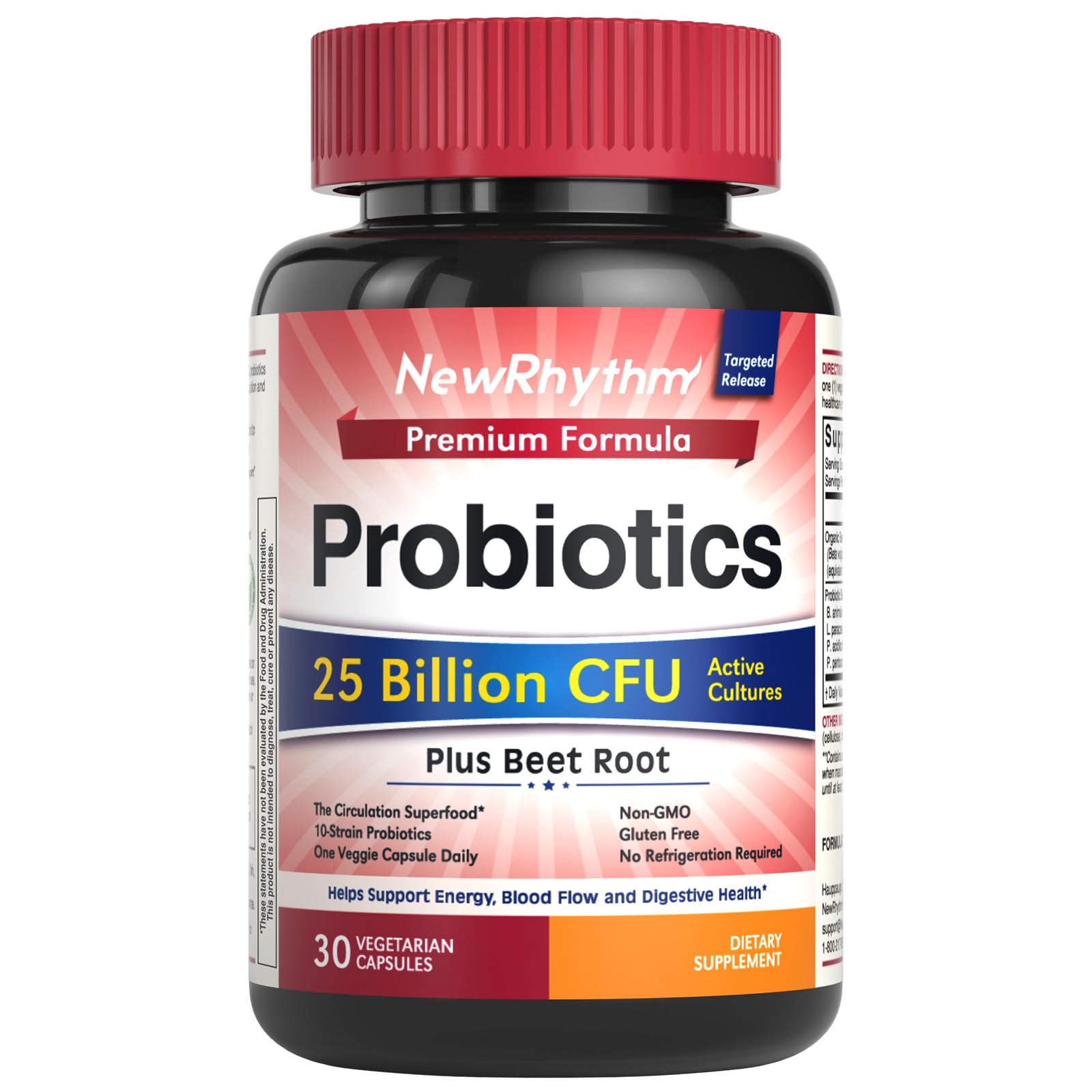 ?100 Natural, Non-GMO, Gluten Free? NewRhythm Probiotics is formulated with 100 natural ingredients and independently tested in the USA. Our supplements are verified non-GMO, gluten-free, and verified free of sugar, soy, yeast, dairy, egg, wheat, corn, peanuts, fish, shellfish, magnesium stearate, artificial ingredients, fillers, binders, and preservatives. ?Made In New York, USA? NewRhythm Probiotics Beet Root is made in a GMP Certificated Facility Based in New York, USA, representing the highest level of technology, quality purity, and consistency. Our Probiotics is Shelf Stable and does NOT require refrigeration. Targeted Release Technology helps probiotics survive stomach acids and reach your intestinal and vaginal tract. ?Clean Inside, Glow Outside ? 10 Lactobacillus, Bifidobacterium strains and beet root work together to support a healthy gut ecosystem - the core of immune metabolic health. Probiotics help enhance digestive comfort and nutrient absorption, while beet root's antioxidants aid in detoxification and internal defenses. Together, they help you feel lighter, cleaner, and more resilient from the inside out. . ?Power up with Organic Beets ? Meet the circulation superfood, Beet Root, rich in natural nitrates to promote healthy circulation and oxygen delivery, giving you a clean, natural energy lift without caffeine jitters. Free of added sugar or calories. Each veggie capsule delivers the strength of 2000 mg beet root to fuel your body, pump up your effort and support over heart health. . ?Digestion and Energy Support in One Go ? NewRhythm Probiotics Beet Root is a premium dual-action formula, combining 25 Billion CFU probiotics and 100 mg of Beet Root 20:1 Extract for daily gut and energy support. This innovative blend helps restore gut flora balance, boost stamina, and keeps you feeling active and refreshed. .