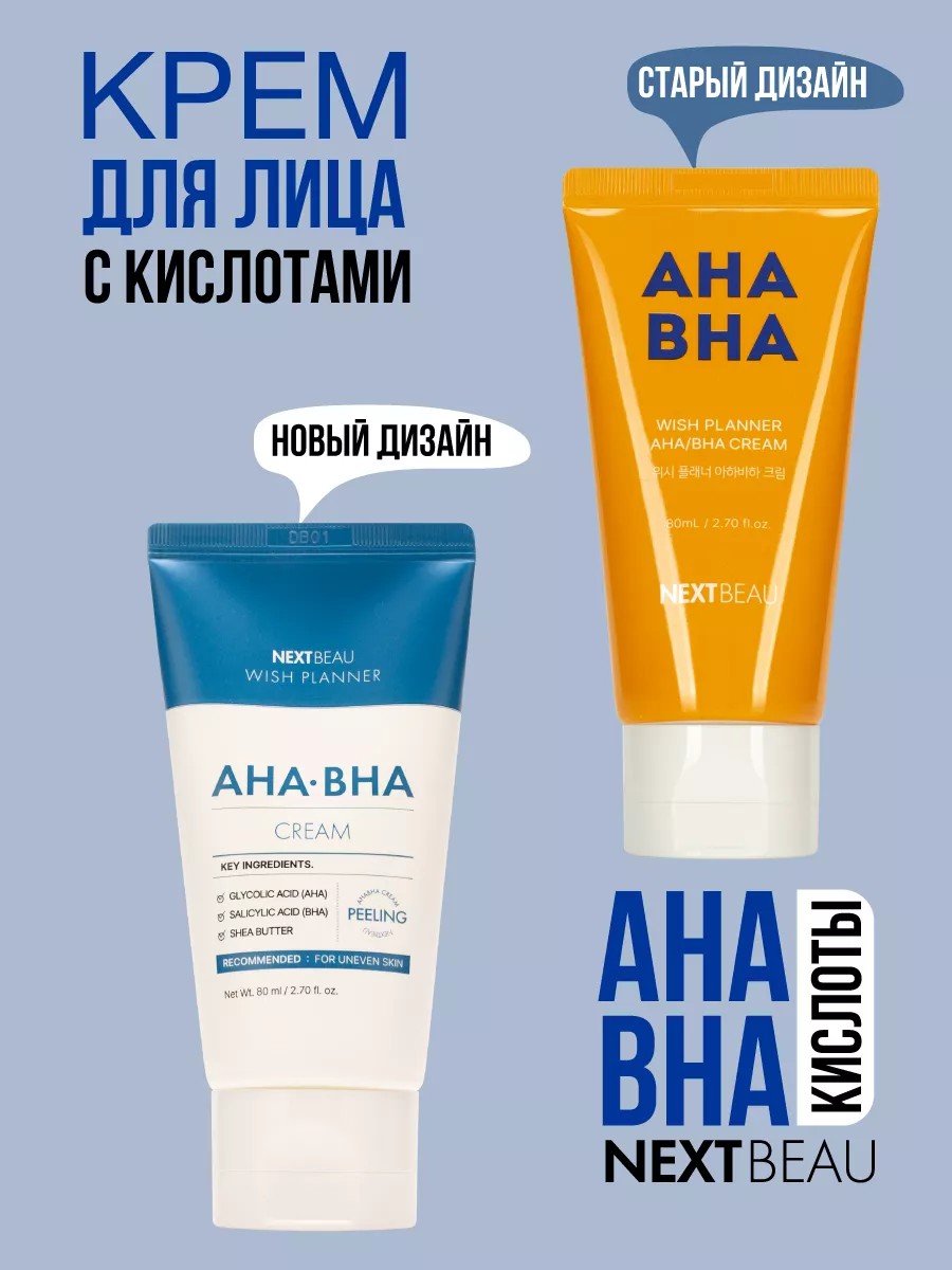 NEXTBEAU Wish Planner AHA/BHA Cream, 80ml Крем с AHA/BHA кислотами для ухода проблемной кожей лица, шеи и зоны декольте, корейская косметика. Этот отшелушивающий крем станет незаменимым помощником в уходе за кожей благодаря комплексному подходу. Омолаживающее действие помогает заметно уменьшить признаки старения, превращая его в идеальный антивозрастной крем. Увлажняющие свойства активно борются с сухостью, обеспечивая коже необходимую влагу и питание. Питательный состав дарит коже здоровый вид и мягкость, способствуя быстрой регенерации клеток. Это средство эффективно убирает морщины, делая кожу более упругой и эластичной. Отшелушивание способствует удалению мёртвых клеток, что помогает восстановлению свежести и яркости лица. Крем с кислотами работает на клеточном уровне, улучшая текстуру кожи и выравнивая её тон. Пользоваться этим продуктом можно как днём, так и на ночь. Он прекрасно впитывается и не оставляет жирного блеска, что делает его идеальным для повседневного использования. Кроме того, крем убирает шелушения, улучшая внешний вид кожи уже после первых применений. Молочная кислота увлажняет, осветляет, омолаживает кожу. Яблочная кислота стимулирует обменные процессы и ускоряет обновление кожи. Аллантоин обладает противовоспалительным, противомикробным действием, смягчает, способствует сужению пор и нормализации выработки кожного сала. Подарите это средство своим близким: маме, подруге или любимой на такие важные даты как 8 марта, день рождения, новый год или день святого Валентина. Так же рекомендуем использовать с другими средствами по уходу за лицом и телом марки NEXTBEAU.