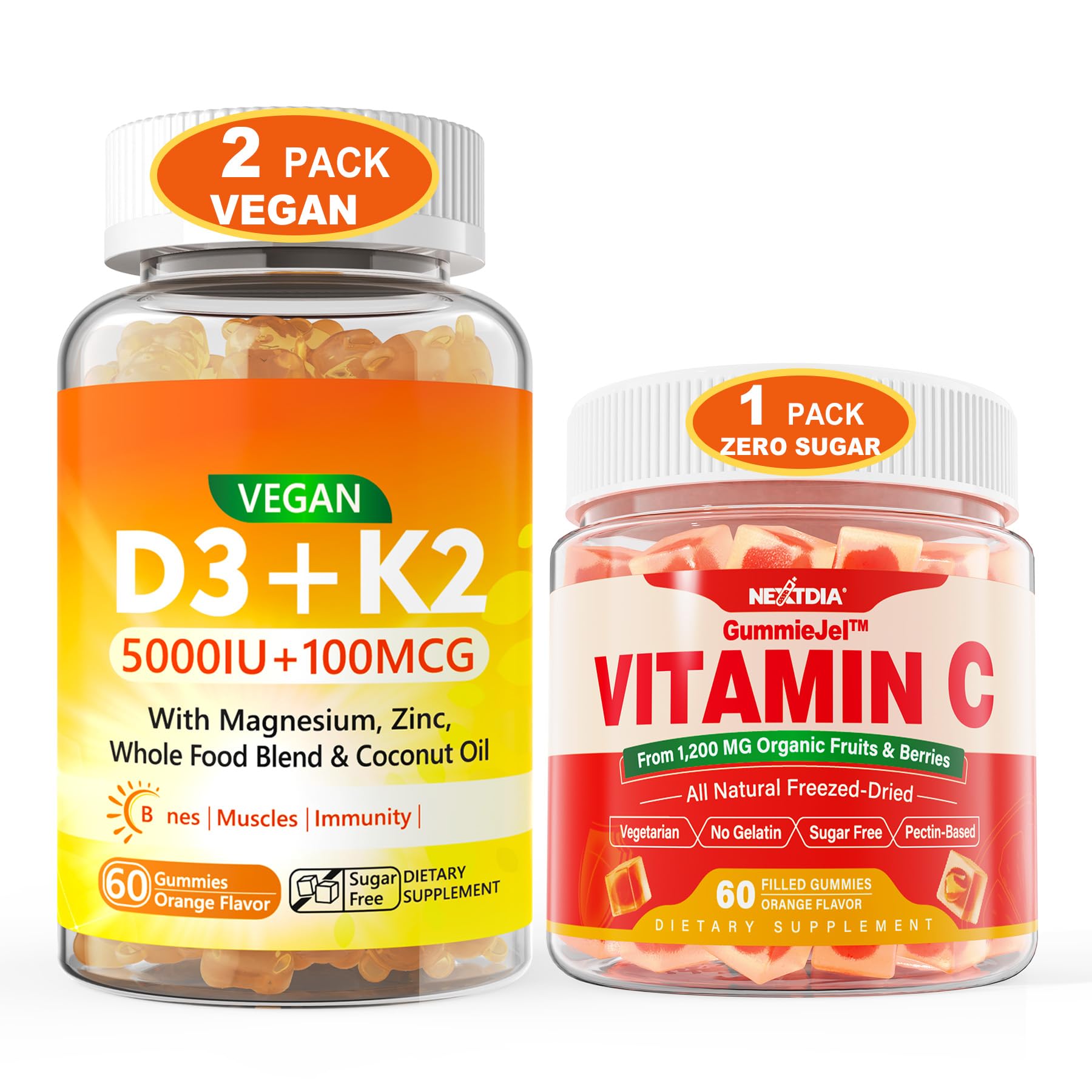 Nextdia 2 Pack Vegan Vitamin D3 5000IU K2 Gummies+ 1 Pack Whole Food Vitamin C Gummies