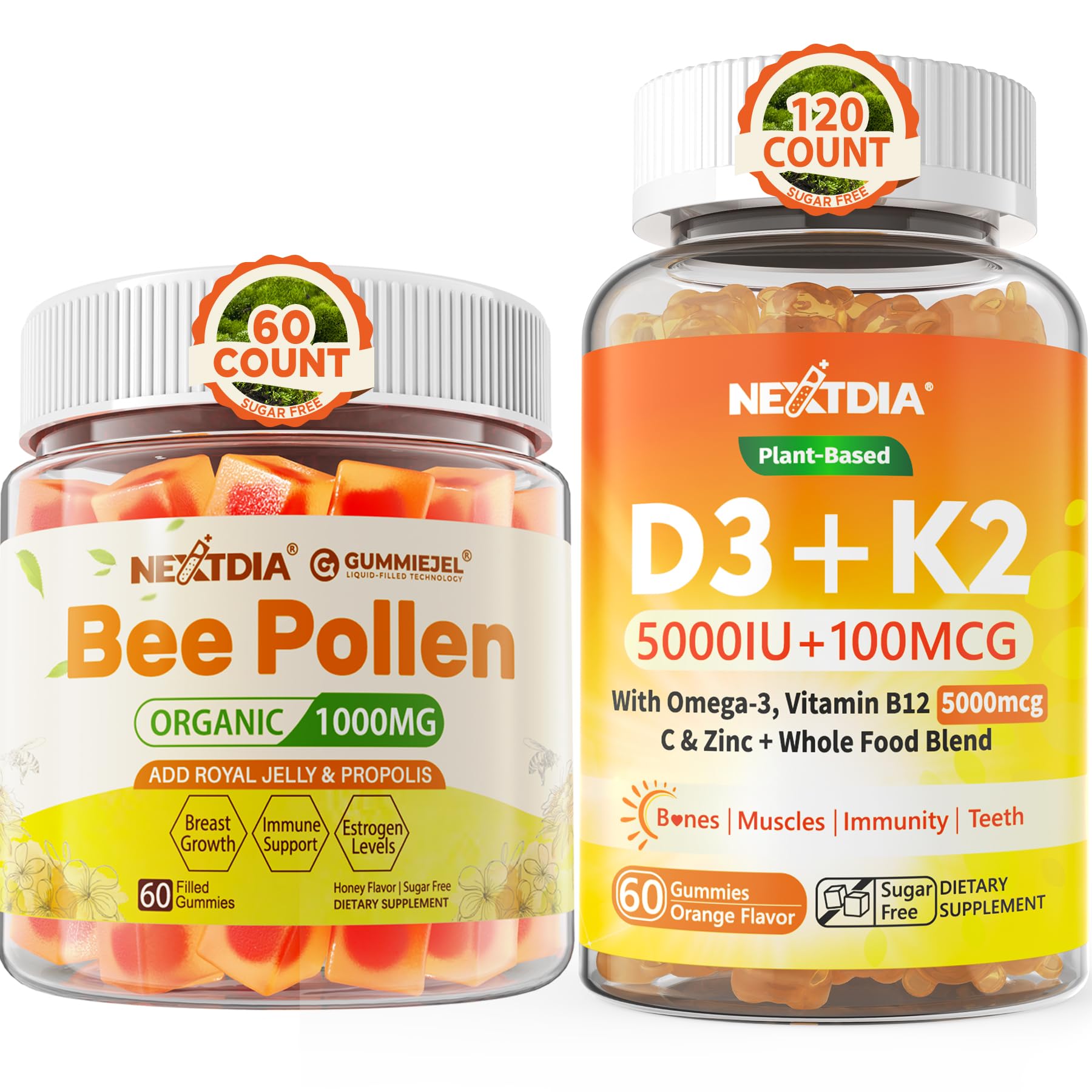 Nextdia Bee Pollen for Breast Growth Organic 1000mg + Organic Plant D3 K2-5X Absorption Than Standard D3K2