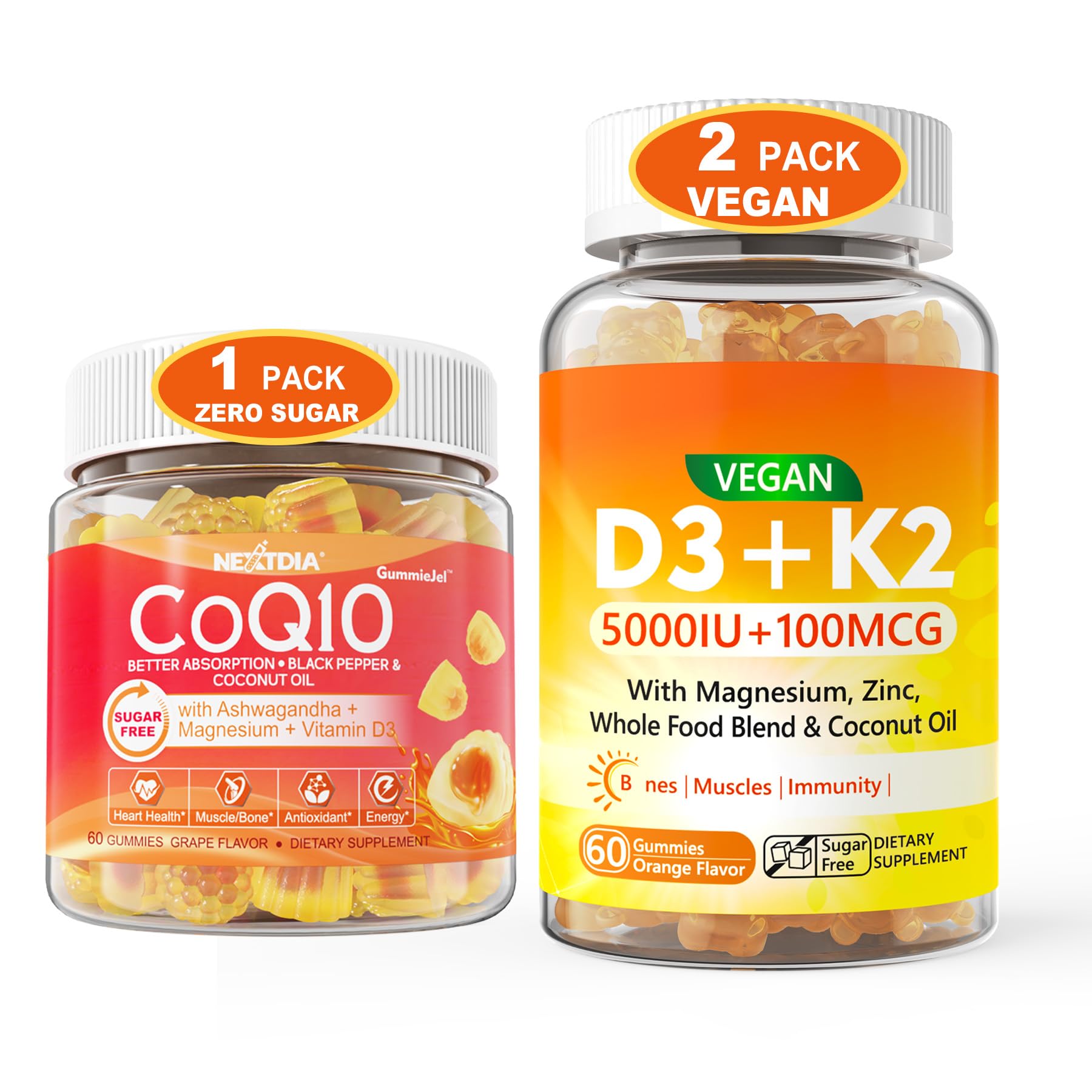Nextdia CoQ10 200mg Filled Gummies 1 Pack + Vegan Vitamin D3 5000IUK2 Gummies 2Pack