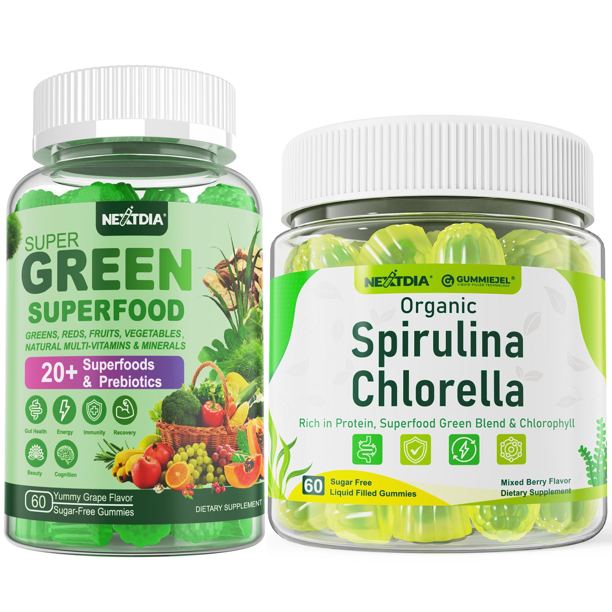 Nextdia Organic Spirulina Chlorella Gummies 1 Pack + Super Greens Gummies 2 Pack