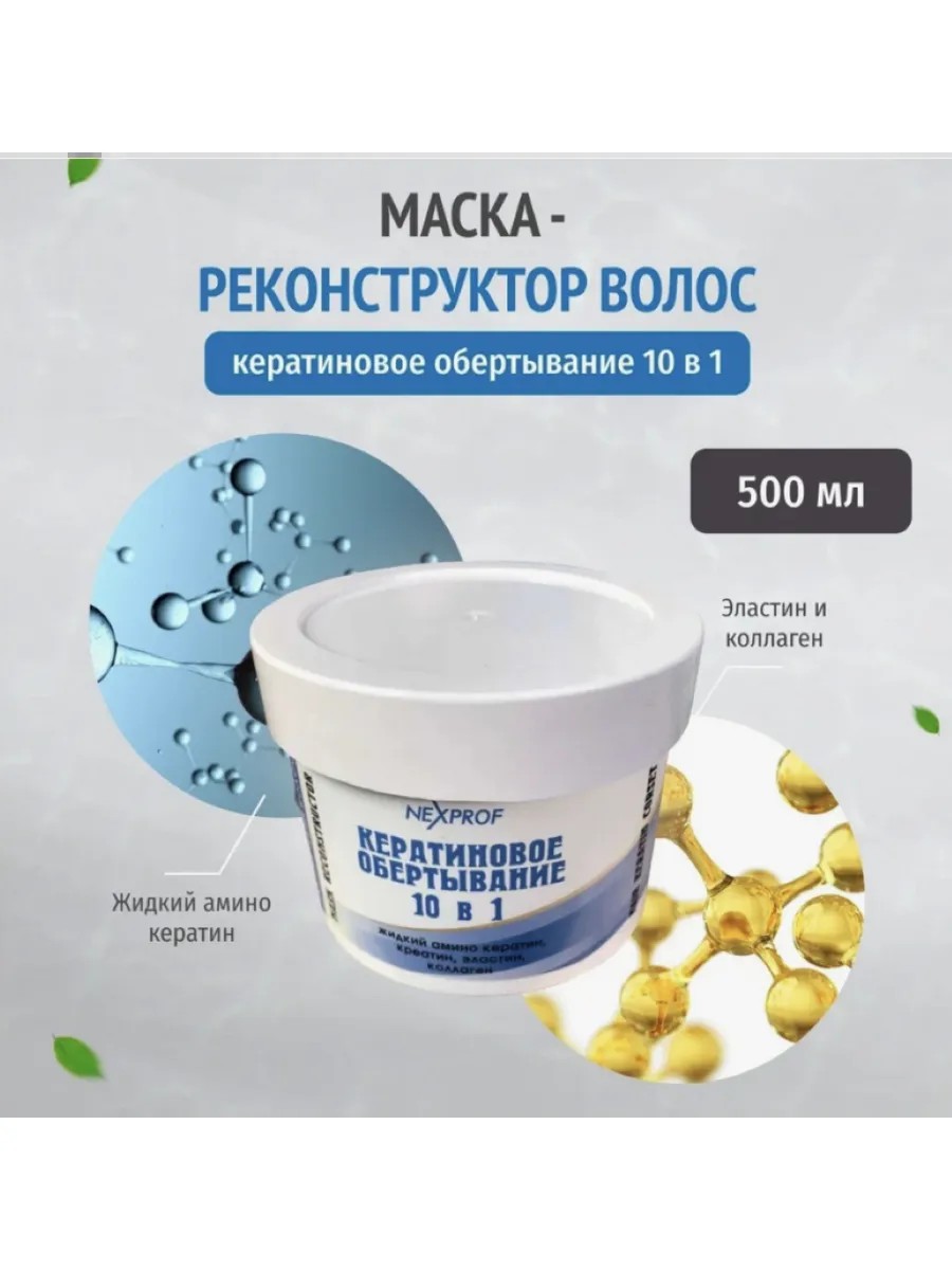 Маска-реконструктор волос 500 мл Кератиновое обертывание 10 в 1 и реставрация волос Жидкий амино кератин, креатин, эластин, коллаген. Комплексное уникальное многофункциональное средство. Эффективно проявляет себя в следующих 10 воздействиях на волосы: реконструкция, восстановление, защита цвета, питание, придание блеска, увлажнение, смягчение, стимуляция роста, разглаживание, уплотнение и укрепление здоровых волос.