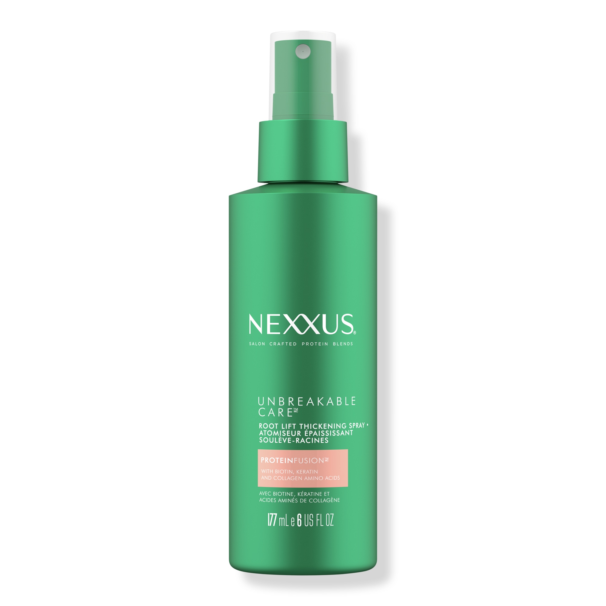 Nexxus Unbreakable Care with Keratin, Collagen, Biotin Root Lift Hair Thickening Spray. Designed specially for fine and thin hair, this root thickening spray lifts roots, visibly thickens strands and protects hair from heat and breakage.