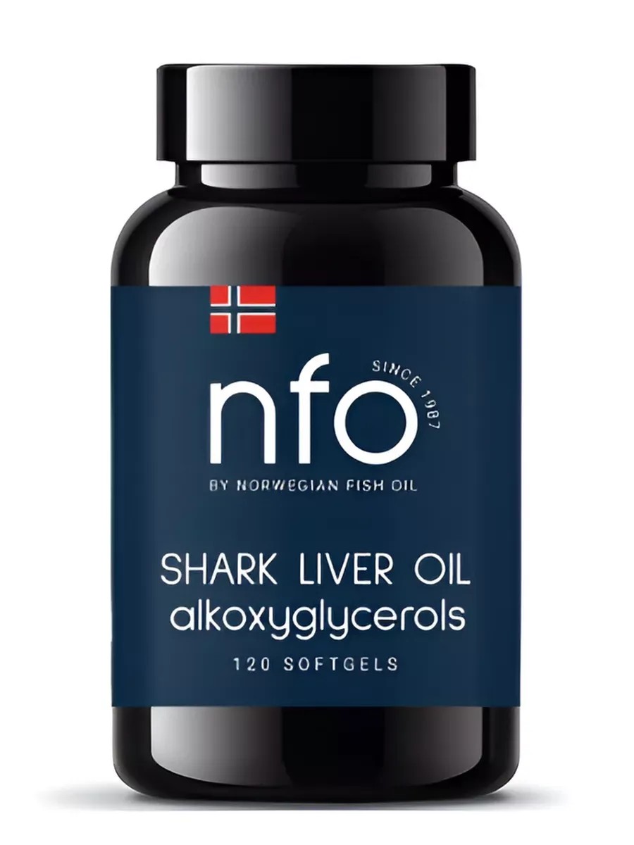 NFO SHARK LIVER OIL - Biologically active food supplement - a unique complex of highly purified shark liver oil with squalene, squalamine and alkoxyglycerides, as well as Omega-3 and vitamins A, D, E to strengthen the immune system and reduce the risk of tumors.