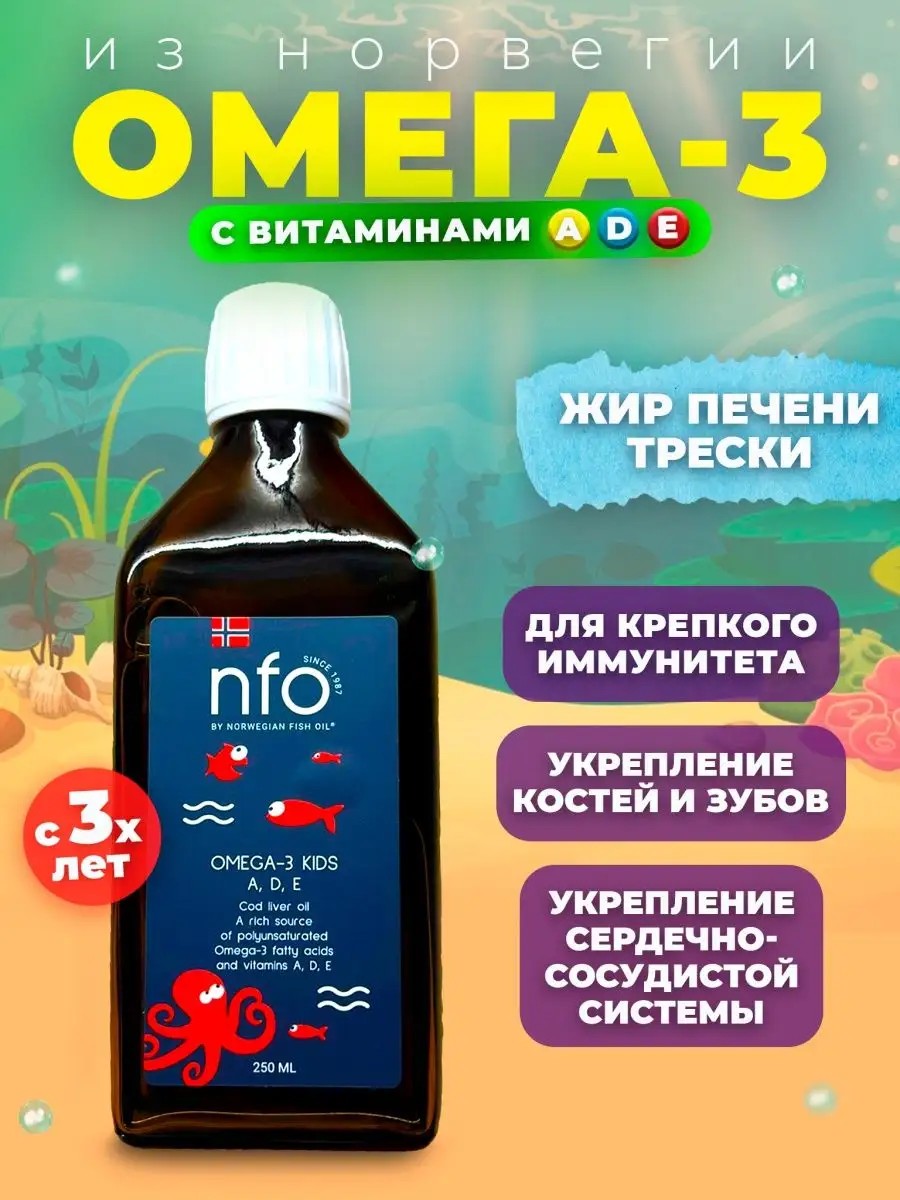 NFO Omega-3 Cod Liver Oil (НФО Омега-3 Жир печени трески) – это жидкий комплекс омега 3 из высокоочищенного жира печени трески с витаминами А, D, Е для здоровья детей. Жир печени трески – один из самых ценных, обладает широким спектром благотворного воздействия на организм. Особенно ценным считается высокоочищенный жир печени трески из рыбы, выросшей в свободных условиях, а не искусственно выращенной. Для производства детского жидкого комплекса омега 3 используется жир печени дикой трески, выловленной в Норвежском море. Витамин А участвует в сложных окислительно-восстановительных процессах, необходим для обеспечения нормального зрения, здоровья кожи, ногтей и волос, крепкого иммунитета и защиты организма от различных заболеваний. Это мощный антиоксидант, относится к жизненно важным витаминам. Детский организм особенно нуждается в омега-3 для правильного формирования нервной системы и мозговой деятельности. Наша жидкая омега-3 поможет вашему ребенку улучшить память, концентрацию внимания и усвоение информации. Кроме того, она способствует укреплению иммунитета и защите от различных заболеваний. В комплексе NFO Omega 3 Cod Liver Oil витамин А находится в виде ретинола пальмитата, являющейся легкоусвояемой формой. Витамин D регулирует фосфорно-кальциевый обмен и усвоение кальция, который в свою очередь отвечает за рост и укрепление костей и зубов. Кроме того, витамин D участвует в иммунных реакциях, обеспечивает нормальную работу иммунной, нервной, сердечно-сосудистой систем способствует укреплению противовирусной и антибактериальной защиты детского растущего организма. В Омега3 витамин Д содержится в легкоусвояемой форме Д3 (холекальциферол), благодаря чему быстро всасывается и встраивается в биохимические процессы. Витамин Е – мощнейший антиоксидант, защищает клетки от свободных радикалов, ускоряет клеточный метаболизм, препятствует разрушению и окислению Омега-3 ПНЖК. В комплексе NFO Omega-3 Cod Liver Oil находится в форме смеси d-альфа-токоферолов. Дефицит веществ, входящих в комплекс omega, может стать причиной задержки развития и роста ребенка, снижения остроты зрения, а также причиной частых простудных заболеваний. Полиненасыщенные жирные кислоты и витамины А, Д, Е в комплексе NFO Omega-3 Cod Liver Oil идеально дополняют друг друга, усиливая благотворное действие на организм. Бад для детей omega 3 подходит для детей от 3х лет, которые еще не умеют жевать. Жидкая омега-3 для детей с 3 лет представлена в удобном формате, который позволяет легко дозировать продукт и добавлять его в любые напитки или пищу. Ваш ребенок не заметит присутствия омега-3, ведь она не имеет неприятного запаха и вкуса. По вкусу напоминает красную икру. Норвежские препараты не уступают по качеству американским NOW. Основные свойства детской жидкой Омеги 3, необходим для правильного роста и развития ребенка. Улучшает память, внимание, мыслительные функции. Уменьшает проявления синдрома гиперактивности и дефицита внимания (СДВГ-синдром). Участвует в формировании и укреплении нервной системы и органа зрения у детей. Активизирует иммунитет, уменьшает риск частых ОРВИ и других инфекций. Улучшает состояние кожи, волос, ногтей. Компенсирует дефицит витаминов А, Д, Е в детском организме при ежедневном приеме. Дарите вашему ребенку здоровье и радость каждый день с нашей жидкой омега-3!