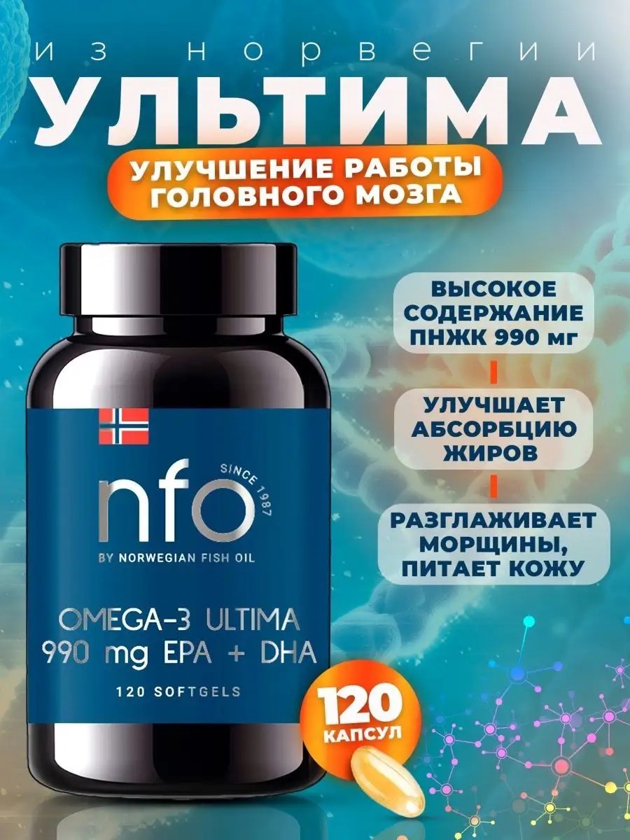 NFO Omega-3 Ultima - это биологически активная добавка с самой высокой (в линейке NFO) концентрацией эйкозапентаеновой (ЭПК) и докозагексаеновой (ДГК) полиненасыщенных жирных кислот (ПНЖК) в одной капсуле. Омега-3 Ультима - ваш идеальный выбор для поддержания здоровья и улучшения общего самочувствия! Натуральный биоактивный комплекс Омега-3 ПНЖК на основе высокоочищенного рыбьего жира в мягких желатиновых капсулах без запаха и вкуса с самой высокой концентрацией ЭПК и ДГК в одной капсуле. Омега-3 - это жирные кислоты, которые необходимы для поддержания здоровья сердца, мозга и сосудов. Они помогают снизить уровень холестерина в крови, улучшить работу сердечно-сосудистой системы и снизить риск развития сердечно-сосудистых заболеваний. Кроме того, Омега-3 Ультима имеет противовоспалительные свойства, которые помогают снизить воспаление в организме, снизить риск развития хронических заболеваний и улучшить общее состояние здоровья. Норвежские препараты не уступают по качеству американским NOW. При производстве NFO Омега-3 Ультима используется только качественное норвежское сырье из обитающей в холодных водах рыбы. Благодаря высокой концентрации незаменимых ПНЖК и содержанию в форме этерифицированных триглицеридов NFO Omega-3 Ultima обладает высокой биодоступностью, что позволяет быстро восстановить уровень омега-3 в организме, обеспечивая необходимый клинический эффект при меньшем потреблении капсул. Самая высокая концентрация ЭПК и ДГК в одной капсуле – 990 мг. Большое количество капсул в банке (120) – хватит надолго. Высокотехнологичное производство по стандартам GMP и ISO.