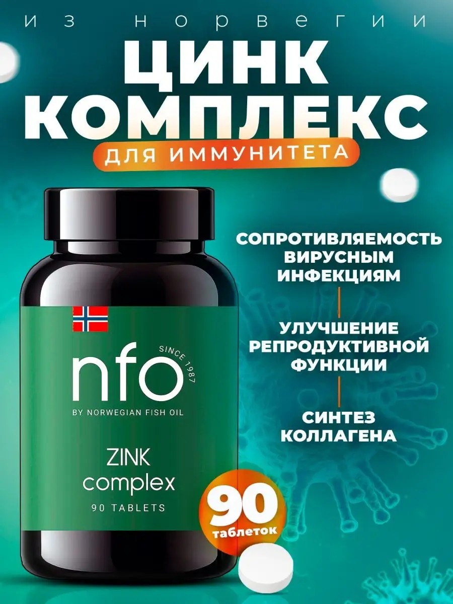 NFO Комплекс Цинка-биоактивный комплекс цинка нового поколения (БАД). Цинк – один из важнейших минералов для поддержания иммунной системы организма. Он участвует в огромном количестве клеточных процессов: в синтезе РНК, в Т-лимфоцитов – иммунных клеток, которые распознают и уничтожают чужеродные агенты, в первую очередь вирусы. Без цинка противовирусные белки (интерфероны) не могут вырабатываться полноценно, что значительно снижает сопротивляемость к инфекционным заболеваниям. Кроме того, цинк участвует в ферментных процессах, способствует синтезу собственного коллагена, влияет на репродуктивную сферу и чувствительность клеток к инсулину, предотвращает выпадение волос. Содержит в своем составе легкодоступный бисглицинат хелат цинка и экстракта черного перца для быстрого устранения дефицита цинка в организме. Бисглицинат хелат цинка - соединение цинка с двумя молекулами аминокислоты глицин для увеличения биодоступности: хелатная форма обладает биодоступностью выше 90%: цинк практически сразу всасывается в кровь. кстракт черного перца содержит алкалоид пиперин, который значимо повышает усвоение цинка организмом, усиливает эффективность его действия. Кроме того, пиперин обладает антиоксидантной активностью, защищая клетки от окислительного стресса. Норвежские препараты не уступают по качеству американским NOW. NFO Комплекс цинка способствует: укреплению иммунитета и противовирусной защите (повышает сопротивляемость вирусным инфекциям, включая Ковид-19), улучшению работы репродуктивной системы (участвует в процессе сперматогенеза и синтеза тестостерона у мужчин), усилению выработки инсулина, повышению чувствительности клеток к этому гормону, синтезу собственного коллагена, предотвращению выпадения волос.