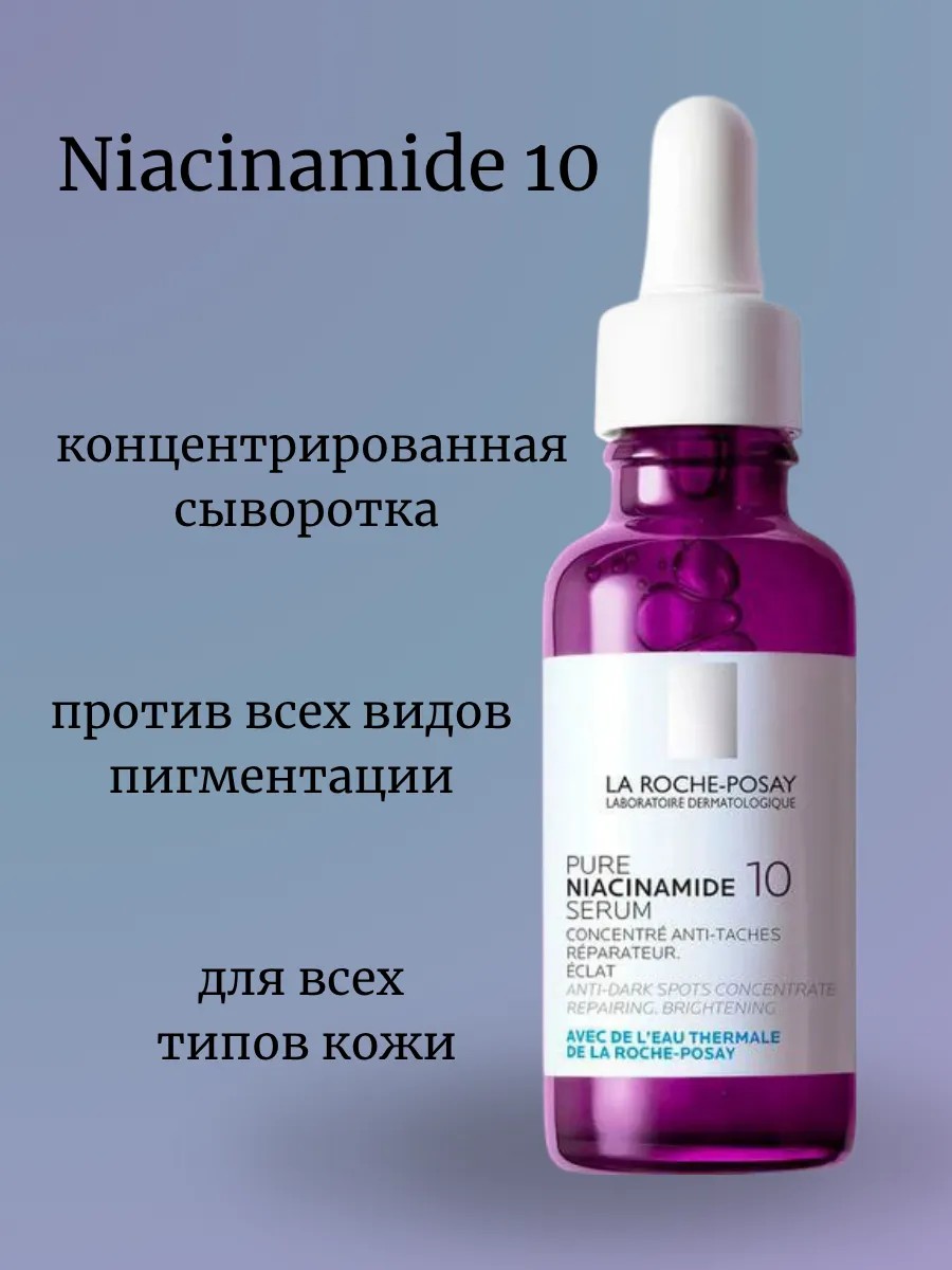 Концентрированная сыворотка La Roche-Posay Niacinamide C10 Serum разработана для борьбы против всех видов пигментации. АКТИВНЫЕ ИНГРЕДИЕНТЫ: Ниацинамид (витамин B3, ниацин или никотиновая кислота) в концентрации 10% регулирует транспортировку меланина к поверхности кожи. Способствует осветлению пигментных пятен и препятствует их повторному появлению. Фе-резорцинол регулирует синтез меланина, обеспечивая стойкий выравнивающий и отбеливающий эффект. Хепес запускает процессы обновления кожи, оказывает регенерирующее действие, способствует выравниванию микрорельефа кожи. Гиалуроновая кислота обеспечивает интенсивное увлажнение кожи, повышает ее упругость и эластичность. Глицерин обладает увлажняющими и смягчающими свойствами, способствует сокращению сухости и шелушения кожи. Лимонная кислота – фруктовая aha-кислота (аха) с выраженными отшелушивающими свойствами. Улучшает процесс клеточной регенерации, помогает пигментацию и сделать цвет лица более ровным. Витамин E (токоферол) – мощный антиоксидант. СПОСОБ ПРИМЕНЕНИЯ: Наносить утром и вечером на очищенную кожу рук, шеи и лица, избегая зоны вокруг глаз. Подходит в качестве базы под макияж. Использовать в сочетании с солнцезащитным средством с SPF не менее 15. ЭФФЕКТИВНОСТЬ: Сыворотка Niacinamide C10 способствует устранению всех видов пигментации, выравнивает тон кожи и возвращает ей здоровое сияние. Действует даже на старые пигментные пятна. Показания: пигментные пятна, связанные с воздействием УФ-лучей или возрастными изменениями, пятна постакне, гиперпигментация после косметологических процедур, тусклый цвет, неровный тон кожи. Через 1 неделю применения область пигментации менее заметна, кожа выглядит более гладкой, свежей и сияющей. Через 2 недели тон и рельеф кожи более ровные, количество и выраженность пигментных пятен значительно уменьшается. Клинически значимые результаты через 1 месяц применения. Протестировано на всех типах кожи. Подходит даже для чувствительной кожи. Некомедогенно.