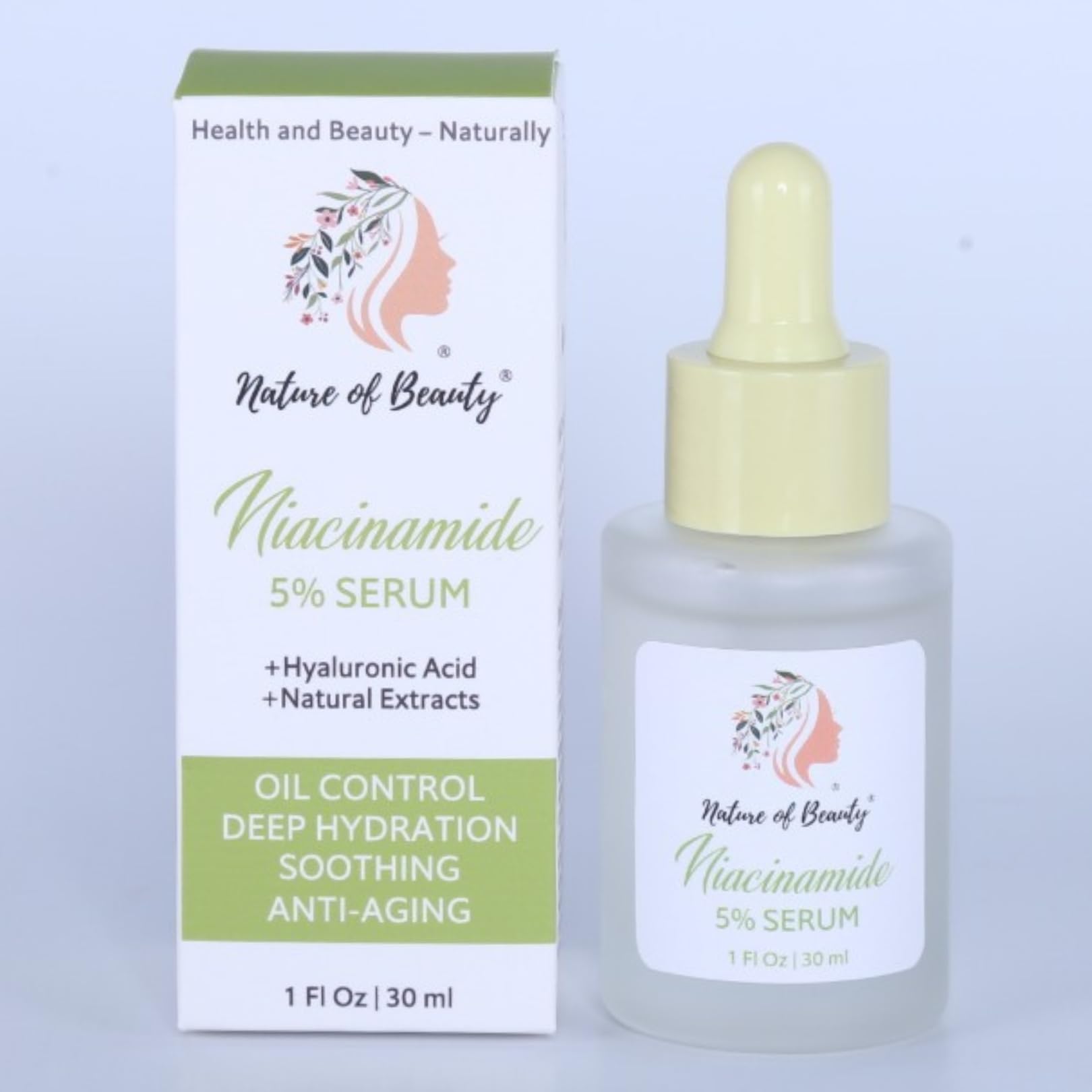 The Nature of Beauty's Niacinamide Serum combines an effective 5 concentration of Niacinamide (Vitamin B3), low-molecular-weight (LMW) hyaluronic acid, and the vitality of natural extracts to deliver the following benefits for your skin: MINIMIZES PORES, CONTROLS OIL: Niacinamide Serum can help balance the skin's oil (sebum) production, which is helpful for those with oily or acne-prone skin. By controlling sebum and improving skin elasticity, it can minimize pores by making them appear smaller and less visible. STRENGTHENS SKIN BARRIER: Niacinamide can help the skin produce more ceramides, which form a protective layer, locking in moisture and keeping out pollutants and other irritants – helping prevent premature skin aging and restoring a vibrant, radiant skin. MOISTURIZING, ANTI-WRINKLE: 5 Niacinamide teams up with 1 Hyaluronic Acid and Natural Extracts for an effective anti-wrinkle, anti-aging and face moisturizing complex. Niacinamide can stimulate collagen production, which improves skin elasticity and reduces the appearance of fine lines and wrinkles. The LMW Hyaluronic Acid penetrates the skin to deeply hydrate without leaving a surface residue. Japanese Camellia, Japanese Lily and Silver Ear Mushroom naturally enhance collagen and reduce oxidation. CALMS and SOOTHES: The Nature of Beauty's complex of Niacinamide, flower extracts and Licorice Root can help calm and soothe the skin and improve an appearance of redness. This makes the Niacinamide Serum especially suitable for skin prone to irritation and can help restore clear, glowing skin. ILLUMINATES, EVENS SKIN TONE: Niacinamide can help brighten and even skin tone, improve dullness, leading to a brighter, more radiant complexion.ILLUMINATES, EVENS SKIN TONE: Niacinamide can help brighten and even skin tone, improve dullness, leading to a brighter, more radiant complexion. CALMS and SOOTHES: The Nature of Beauty's complex of Niacinamide, flower extracts and Licorice Root can help calm and soothe the skin and improve an appearance of redness. This makes the Niacinamide Serum especially suitable for skin prone to irritation and can help restore clear, glowing skin. MOISTURIZING, ANTI-WRINKLE: 5 Niacinamide teams up with 1 Hyaluronic Acid and Natural Extracts for an effective anti-wrinkle, anti-aging and face moisturizing complex. Niacinamide can stimulate collagen production, which improves skin elasticity and reduces the appearance of fine lines and wrinkles. The LMW Hyaluronic Acid penetrates the skin to deeply hydrate without leaving a surface residue. Japanese Camellia, Japanese Lily and Silver Ear Mushroom naturally enhance collagen and reduce oxidation. STRENGTHENS SKIN BARRIER: Niacinamide can help the skin produce more ceramides, which form a protective layer, locking in moisture and keeping out pollutants and other irritants – helping prevent premature skin aging and restoring a vibrant, radiant skin. MINIMIZES PORES, CONTROLS OIL: Niacinamide Serum can help balance the skin's oil (sebum) production, which is helpful for those with oily or acne-prone skin. By controlling sebum and improving skin elasticity, it can minimize pores by making them appear smaller and less visible. The Nature of Beauty's Niacinamide Serum combines an effective 5 concentration of Niacinamide (Vitamin B3), low-molecular-weight (LMW) hyaluronic acid, and the vitality of natural extracts to deliver the following benefits for your skin:.