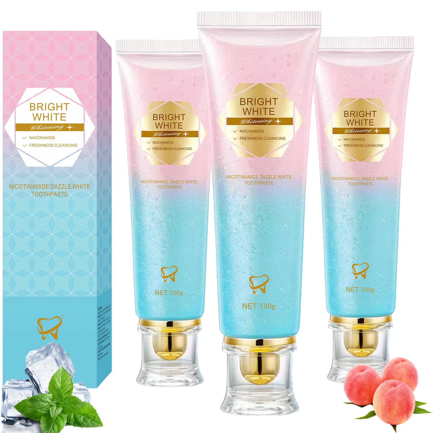 Gentle Yet Effective Suitable for daily use, this toothpaste gently polishes without damaging enamel, making it ideal for long-term care of sensitive teeth and overall oral hygiene. Supports Oral Health Beyond whitening, the formula helps maintain a balanced oral environment, supporting gum health and breath freshness for all-day comfort and confidence. Innovative Dual-Color Formula The dual-layer paste combines whitening and cleaning power in one step, simplifying your routine. Just brush twice daily—no additional whitening products needed. Long-Lasting Freshness Infused with a refreshing mint flavor, it instantly freshens breath and combats odor-causing bacteria, keeping your mouth clean, cool, and confident throughout the day. Nicotinamide Whitening Toothpaste Formulated with niacinamide essence, this toothpaste effectively removes surface stains from coffee, tea, and more—revealing a visibly brighter smile with consistent use.
