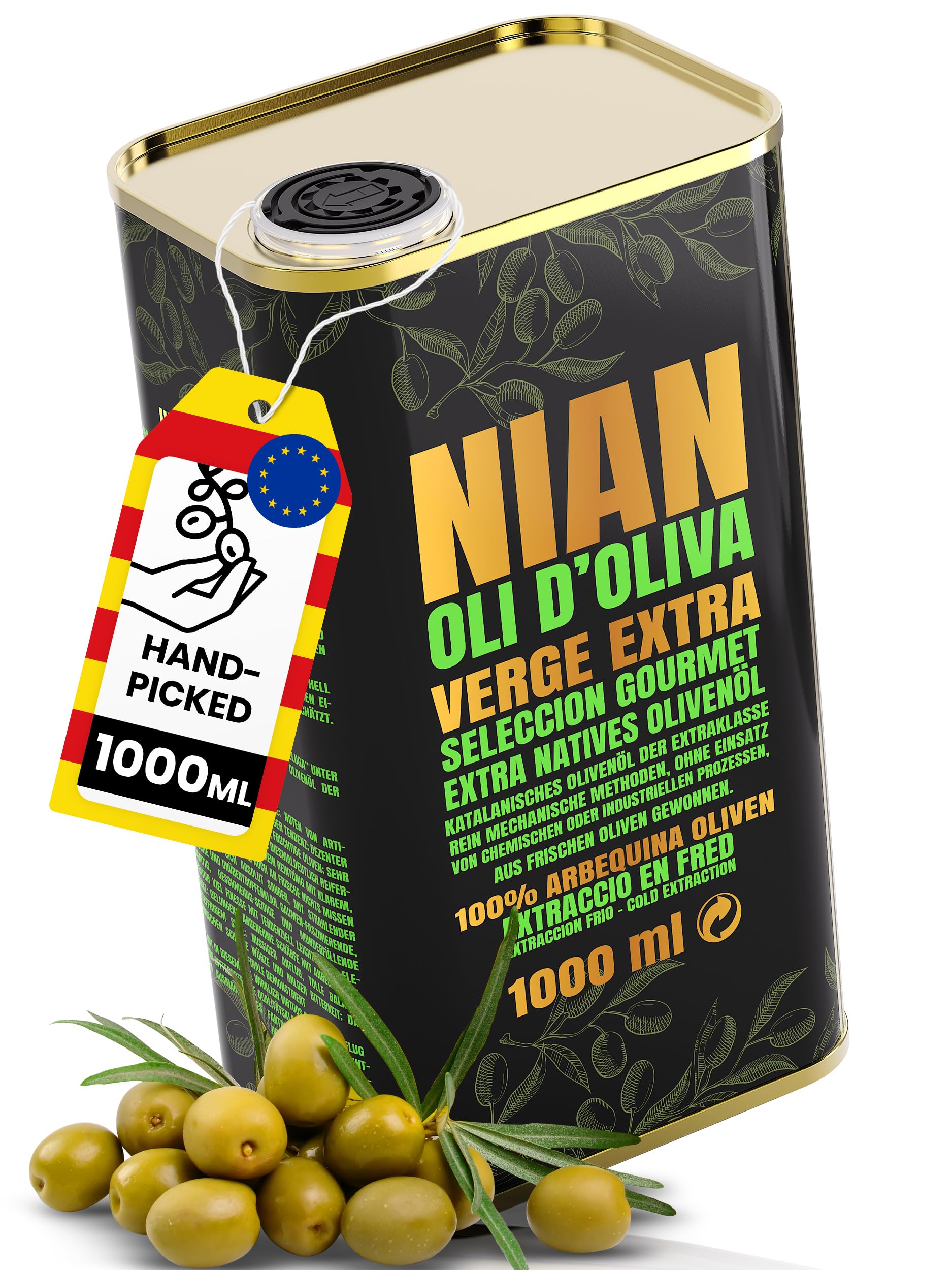 NIAN Huile d'olive extra vierge - Bidon de 1 litre - Huile d'olive des chefs étoilés - 100 pure - Olives Arbequina de dernière récolte - Bidon de recharge avec bec verseur pratique 1 x 1L native