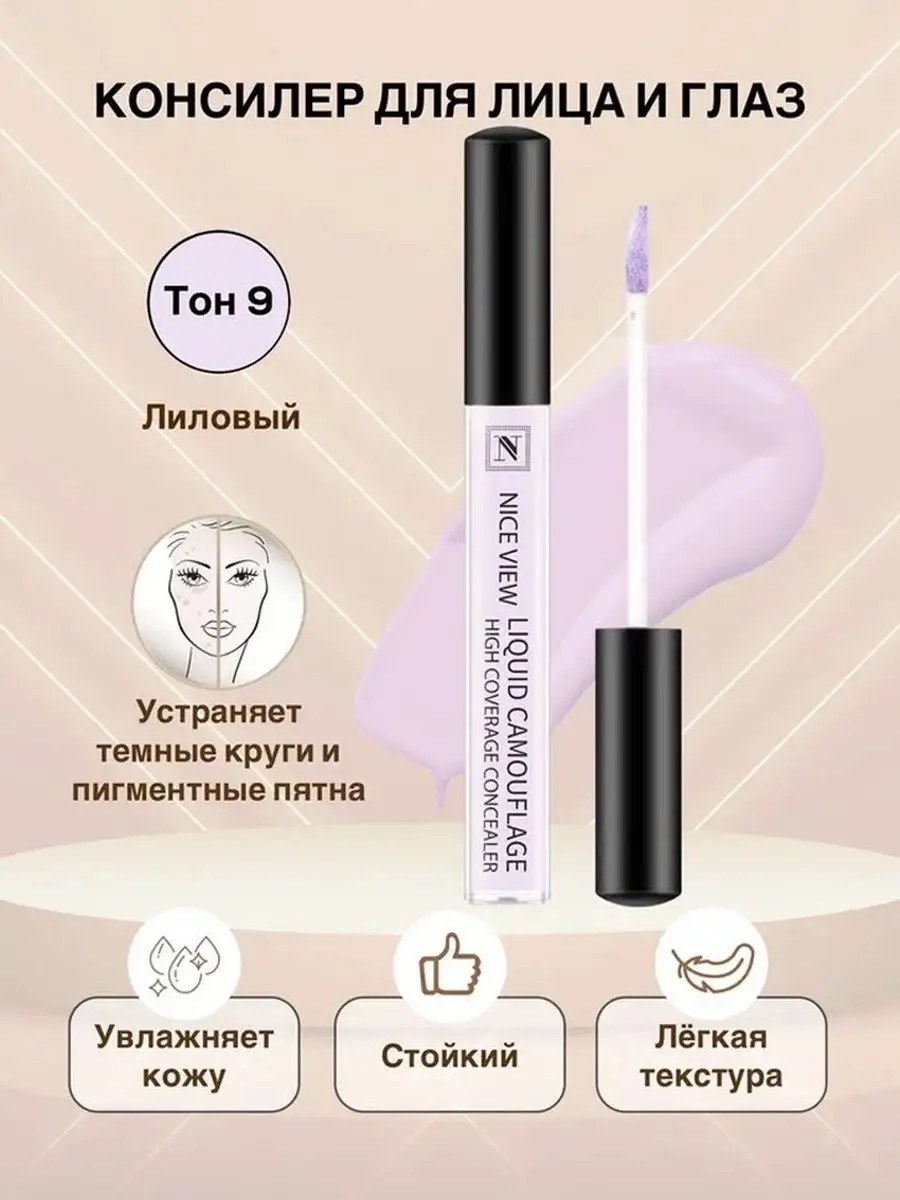 Nice View's liquid concealer is a product for concealing localized skin imperfections. Unlike foundation, it contains more pigment, so it requires targeted application. Its lightweight texture evens out skin tone; highlights areas of the face to create a defined contour; conceals pimples and small age spots; reduces the appearance of wrinkles; and hides pores, redness, and small spider veins. The convenient, soft applicator ensures precise application, and its lightweight texture allows the concealer to blend seamlessly with the skin. The concealer can be used as a base for lip makeup, evening out lip tone, preparing them for further application, and making the applied shade more saturated and expressive. Green corrector is especially effective for problematic skin, helping to conceal redness, acne, rosacea, spider veins, and other imperfections. Yellow corrector will help conceal dark circles, disguise purple bruises and veins, correct redness, and hide visible capillaries. Purple corrector neutralizes yellow tones on the face and camouflages age spots. Directions: Apply beige shades to problem areas of the face after foundation, and colored shades before.