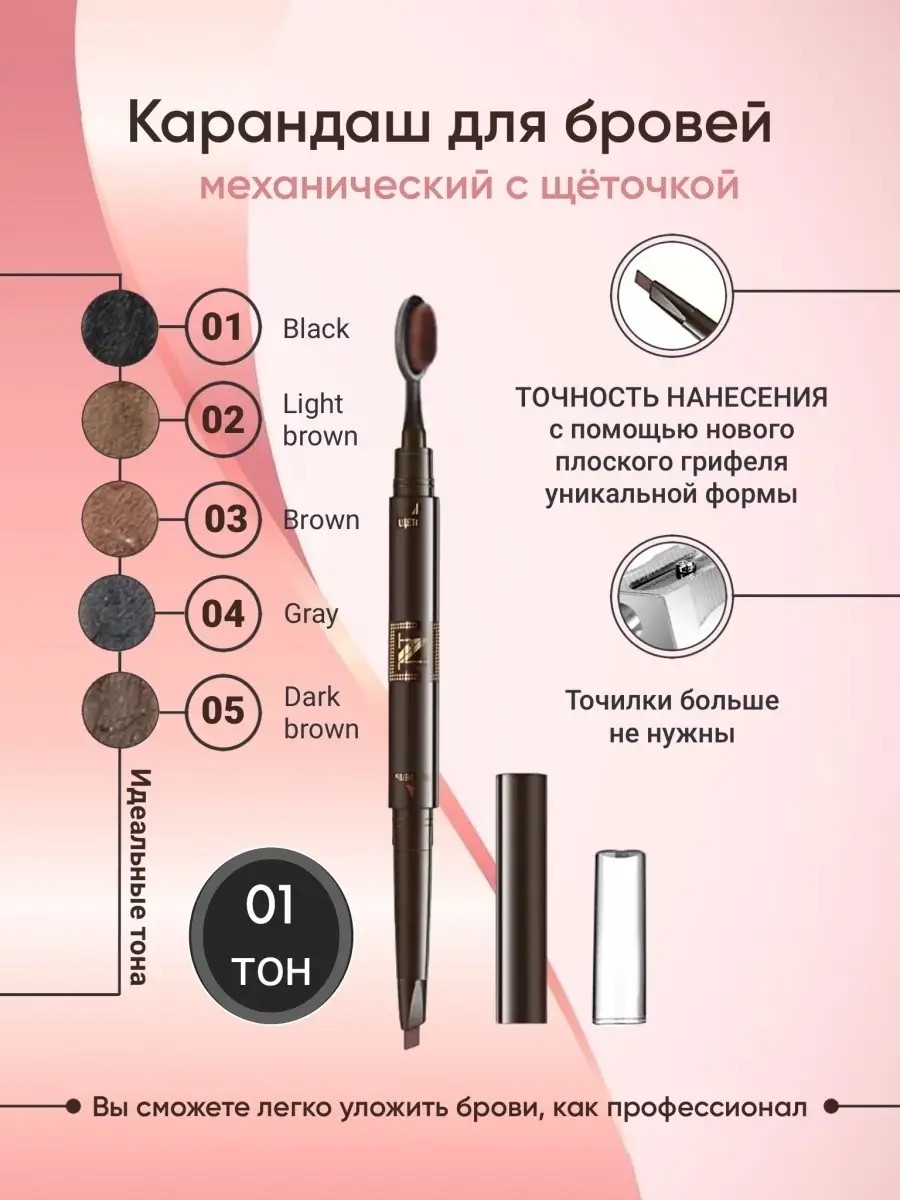 Карандаш для бровей от Nice View не только придает яркий оттенок, но и обеспечивает невероятную точность нанесения с помощью новой плоской щёточки уникальной формы. Вы сможете легко уложить брови, как профессионал. Треугольный кончик карандаша позволяет создать желаемую форму: используйте плоскую сторону для более естественного макияжа, а заостренную для ярко выраженного эффекта. Легкость нанесения и никаких точилок! Все оттенки подобраны с учётом разных типажей внешности, выглядят естественно и подстраиваются под цвет кожи. Карандаш не слишком кремовый и не слишком сухой - грифель идеальной текстуры раз за разом позволяет добиваться ровно той насыщенности, которая вам нужна. Карандаш для бровей Nice View идеальная форма и оттенок - все, о чем ты мечтала!