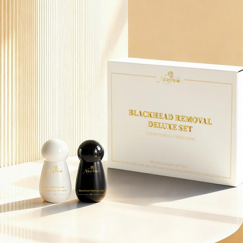 This NiceRose Blackhead Removal Deluxe Set offers a gentle yet effective solution for achieving clearer, smoother skin. The two-step system includes a deep cleansing liquid that softens sebum and lifts out stubborn blackheads from pores, followed by a pore shrink serum that helps reduce oil production and refine the appearance of your nose and face. Unlike harsh manual squeezing that can lead to infection and enlarged pores, or aggressive extraction tools that damage skin, this set works through a safe absorption process. The cleansing formula penetrates deep into pores to dissolve and remove dirt and impurities, while the serum helps tighten and repair skin for a refreshed complexion. Say goodbye to strawberry nose and hello to visibly clearer pores. This luxury gift set provides a complete blackhead removal solution that's suitable for regular use, helping you maintain fresh, clean skin without the sensitivity caused by frequent acid exfoliation or the pore-clogging effects of heavy foundation. Perfect for anyone seeking a gentler approach to blackhead removal and pore care.