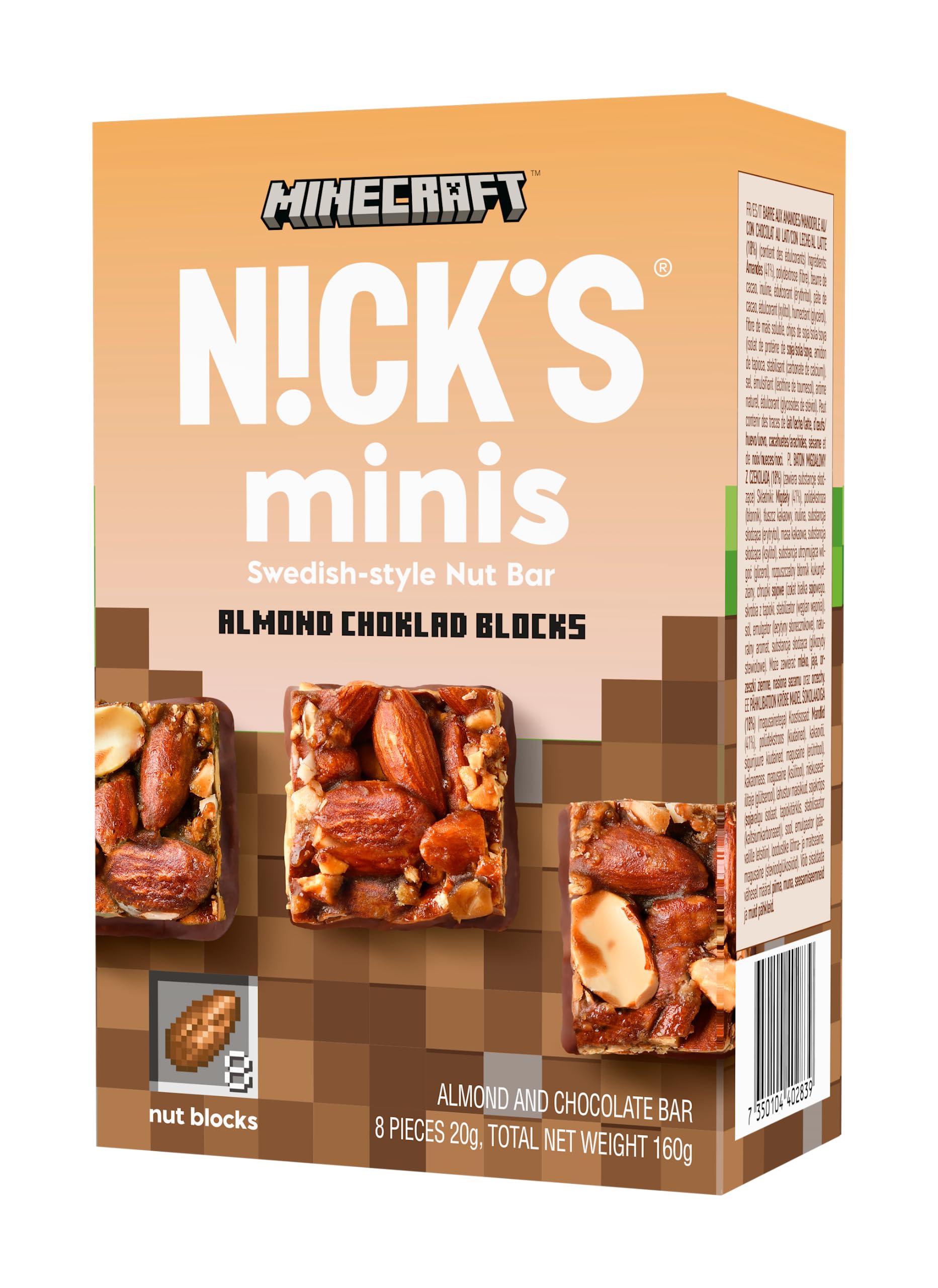 Nicks nut bar as a block in a Minecraft collaboration.The perfect gaming snacks!Intensive, thin dark chocolate with crispy almonds and a pinch of sea salt, in a 3 -pack, to spoil yourself or maybe as a gift for a loved one.Low carb, keto and popular with diabetics, but especially for everyone who wants to enjoy and want to feel comfortable at the same time.Vegan without adding sugar, no palm oil, just joy. Ingredients ingredients Almonds (41 ), polydextrose (fiber), cocoa butter, inulin, sweetener (erythritus), cocoa mass, sweetener (xylitol), moisture retention (glycerin), soluble corn fiber, soy crint (soyprotein isolate, tapioca load (calcium carbonate), salt, salt, salt, salt, salt,Emulgator (sunflower lecithin)), natural aroma, sweetener (steviolglycosides).Buildingwith blocks that are free of palm oil and gluten.Experience the Minecraft-overworld with 8 delicious blocks per pack, which contain 23 healthy fiber.World is created Loading Snack Time, suitable for everyone, including vegans without milk or animal products.Break blocks without adding sugar, this time with your mouth for a well -deserved snack break.Tough almond blocks covered with delicate chocolate, a perfect sweet gift for Minecraft players.Nicks Nussriegel als Block in einer Minecraft-Kollaboration. Die perfekten Gaming-Snacks! Intensive, dünne dunkle Schokolade mit knusprigen Mandeln und einer Prise Meersalz, im 3er Pack, um sich selbst oder vielleicht als Geschenk für einen lieben Menschen zu verwöhnen. Low Carb, Keto und beliebt bei Diabetikern, aber vor allem für alle, die gleichzeitig genießen und sich wohl fühlen wollen. Vegan Ohne Zuckerzusatz, kein Palmöl, einfach Freude. INHALTSSTOFFE ZUTATEN MANDELN (41 ), Polydextrose (Ballaststoffe), Kakaobutter, Inulin, Süßungsmittel (Erythrit), Kakaomasse, Süßungsmittel (Xylit), Feuchthaltemittel (Glycerin), lösliche Maisfaser, SOJA-Kropfen (SOJAproteinisolat, Tapiokastärke, Stabilisator (Calciumcarbonat), Salz, Emulgator (Sonnenblumenlecithin) ), natürliches Aroma, Süßstoff (Steviolglykoside).BAUEN MIT BLÖCKEN, die frei von Palmöl und Gluten sind. ERLEBEN SIE DIE MINECRAFT-OVERWORLD mit 8 leckeren Blöcken pro Packung, die 23 gesunde Ballaststoffe enthalten. WELT WIRD ERSTELLT LOADING SNACK TIME, geeignet für alle, auch Veganer ohne Milch oder tierische Produkte. BRECHEN SIE BLÖCKE OHNE ZUCKERZUSATZ, diesmal mit dem Mund für eine wohlverdiente Snackpause. ZÄHIGE MANDELBLÖCKE überzogen mit zarter Schokolade, ein perfektes süßes Geschenk für Minecraft-Spieler.NICKS Minecraft Minis, Mandel Schokolade Blöcke, ohne Zuckerzusatz, glutenfrei, ohne Palmöl, vegane Nuss-Snackriegel 160g (8x20g) Mandel 160 g (1er Pack)