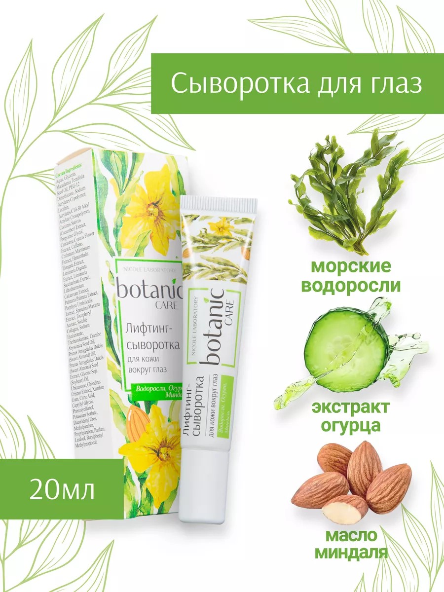 Омолаживающее средство для глаз Лифтинг-сыворотка botanic CARE увлажняет, выравнивает тон и восстанавливает упругость кожи вокруг глаз. Экстракт морских водорослей насыщает кожу полезными микроэлементами, улучшает микроциркуляцию и способствует уменьшению отеков. Экстракт огурца освежает и смягчает кожу, выравнивает тон и способствует осветлению, снимает отечность, в том числе утреннюю припухлость под глазами. Масло миндаля богато витаминами Е, F, A, группы B, активно питает, омолаживает и регенерирует кожу. Активный ингредиент растительного происхождения Polylift, полученный из протеинов сладкого миндаля, обеспечивает оптимальный подтягивающий эффект, придает упругость. Сильнейший антиоксидант Коэнзим Q10 замедляет процессы старения, активизирует регенерацию, обеспечивает выраженный эффект лифтинга. Гиалуроновая кислота и коллаген интенсивно увлажняют, препятствуют потере влаги, стимулируют синтез коллагена, повышают эластичность кожи. Кофеин тонизирует и заряжает клетки энергией.