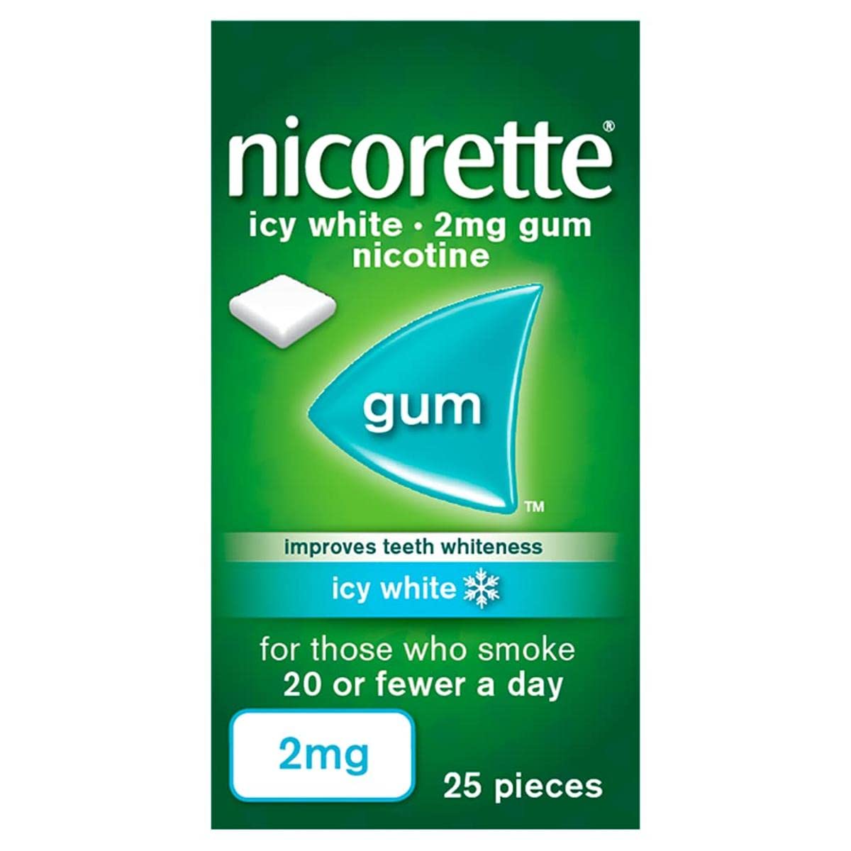 NICORETTEGum is a Nicotine Replacement Therapy (NRT) that helps to relieve and or prevent withdrawal symptoms and reduce the cravings you get when you try to stop smoking or when cutting down the number of cigarettes you smoke. NICORETTEGum helps fights 7 withdrawal symptoms of quitting - cravings, irritability, low mood, restlessness, anxiety, poor concentration and increased appetite. Chew a piece of gum whenever you feel the urge to smoke, up to a maximum of 15 pieces a day. NICORETTEGum is sugar free and comes in 2mg and 4mg strength. It is available in a variety of pack sizes. You can choose from a variety of flavours: Original, Freshmint, Icy White and FruitFusion. Actively fight cravings with NICORETTEGum! Nicorette contains nicotine, stop smoking aid, requires willpower, always read the label. INGREDIENTS Core Gum Chewing gum base, containing butylated hydroxy toluene (E321) Xylitol Peppermint oil Sodium carbonate, anhydrous Sodium hydrogen carbonate Acesulfame Potassium Levomenthol Magnesium oxide, light Talc Sub coating Winterfresh Hypromellose Sucralose Polysorbate 80 Purified water Hard Coating Xylitol Starch Titanium dioxide (E171) Winterfresh Carnauba wax Purified water DIRECTIONS Nicorette Icy White 2 mg Gum product strength is suitable for those smoking 20 cigarettes or fewer a day. For adults and children 12 years and over: Please note the chewing technique below. Chew one piece when you feel the urge to smoke. Do not use more than 15 pieces a day. Chewing Technique: 1. Chew slowly until the taste becomes strong. 2. Rest between gum and cheek. 3. chew again when taste has faded. Nicorette icy white 2mg gum is used to relieve and or prevent withdrawal symptoms and reduce the cravings you get when you try to stop smoking or when cutting down the number of cigarettes you smoke. However it can be used in a number of different ways, either to completely replace all your cigarettes, or if you do not feel ready to stop smoking completely, to replace certain cigarettes and therefore help you to cut down the number of cigarettes you smoke. It may also help increase your motivation to quit. Requires willpower. Read the package leaflet before use. SAFETY WARNING Please read the enclosed leaflet carefully before starting to use the product. Do not take more medicine than the label tells you to. If you are pregnant, talk to your doctor, pharmacist or nurse for advice before using this product or if you need any advice before starting to use this product, talk to your doctor, pharmacist or nurse. Do not use if you are allergic to any of the ingredients listed. Keep out of the sight and reach of children. Do not store above 25ºC. Dispose of sensibly. Stop smoking aid. Requires willpower. LEGAL DISCLAIMER This product contains nicotine and therefore can be sold only to customers above 18 years old. BOX CONTAINS 25 x Nicorette Gum See moreALSO HELPS IMPROVE TEETH WHITENESS Stop Smoking Aid Also Whitens Teeth. CHOOSE THE RIGHT STRENGTH FOR YOU: Comes in 2mg or 4mg to let you choose the right strength based on how much you smoke. HELPS BREAK THE HABIT AND QUIT SMOKING FOR GOOD: The positive effects of quitting smoking can kick in as early as 20 minutes after the end of your last cigarette with your blood pressure and heart rate returning to normal. A FRESH-TASTING WAY TO STOP SMOKING : Nicorette gums are quit smoking aids that taste great and allow you to actively control how much nicotine you use. FIGHTS WITHDRAWAL SYMPTOMS : Nicorette Gum helps fight 7 withdrawal symptoms of quitting - cravings, irritability, low mood, restlessness, anxiety, poor concentration and increased appetite. HELPS TO KEEP CRAVINGS IN CHECK : Nicorette Gum actively helps fights cravings to help you quit smoking once and for all.