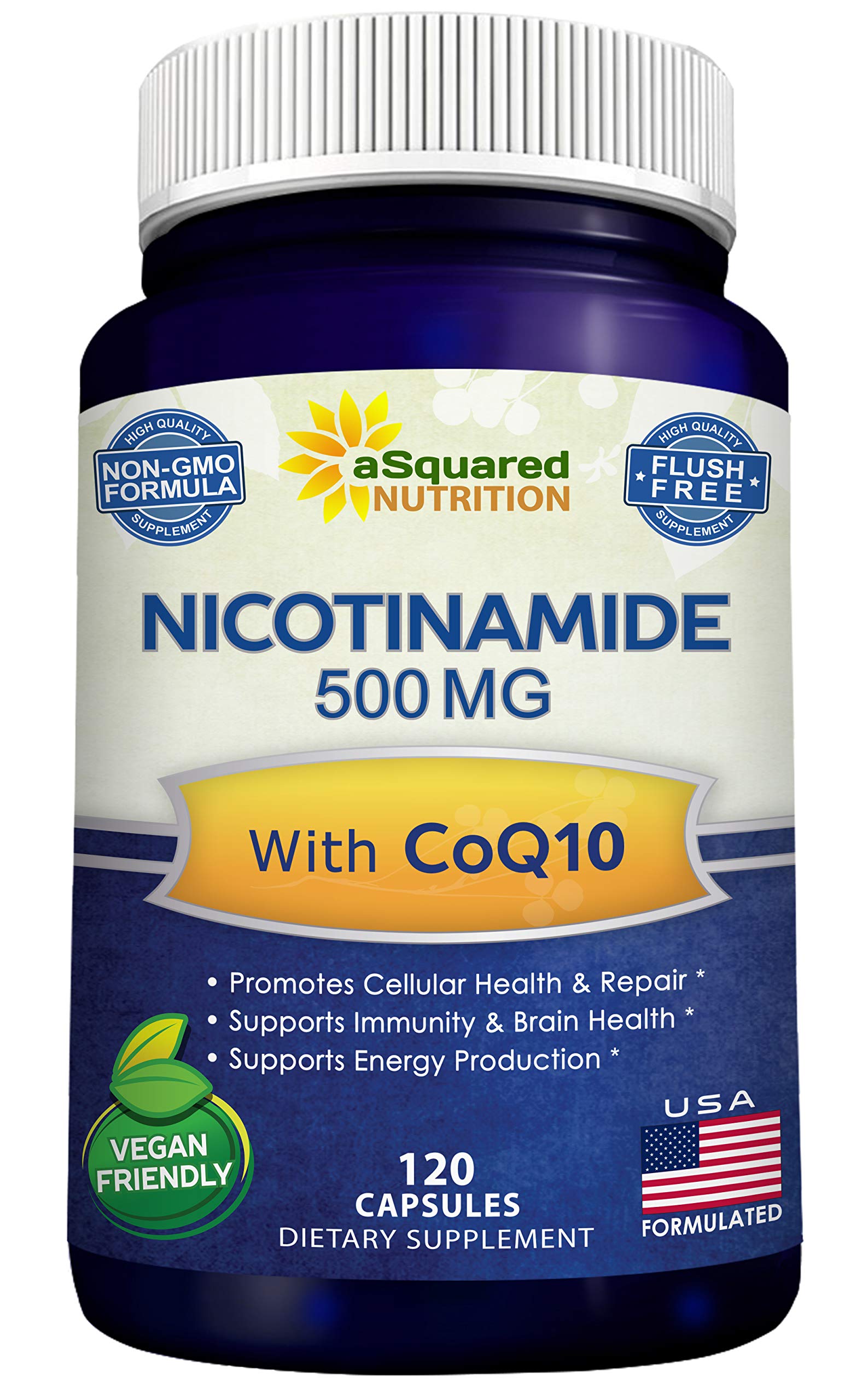 COMMON NAMES FORMS: Nicotinamide, also known as Niacinamide, is a form of Vitamin B3 that is Non-Flush. It comes in capsules, pills, tablets, soft gels, gummies, liquid, drops, gel and powder form. Usually, it is seen in 150mg, 200mg, 250mg, 300mg and 500mg per capsule. Works great with Nicotinamide Riboside, NMN, and Resveratrol 1000mg. . SUPPORTS NAD LEVELS: Nicotinamide is flush free, and should not be confused with Niacin or nicotinic acid. Our proprietary complex contains 500mg of Nicotinamide 100mg of CoQ10 powder to help support normal NAD NAD levels (Nicotinamide adenine dinucleotide), and to support cellular health longevity. Try also our Resveratrol 1000mg, Methyl B12, Quercetin Dihydrate with Zinc, and Liposomal Vitamin C. . PROMOTES ENERGY PRODUCTION: As we age our energy levels naturally decline. Our unique formula helps your cells metabolize synthesize nutrients more effectively to boost energy. Our natural formula contains 120 capsules per bottle, is vegan friendly, Non-GMO, and Gluten Free. . AMAZING PROPRIETARY FORMULA: Our natural Nicotinamide Coenzyme Q-10 formula supports energy levels, and helps boost immunity, brain health, cognition. Nicotinamide CoQ10 may help combat age related decline in energy levels, and promotes cellular DNA health. A prominent element of the metabolic pathway, Nicotinamide is vital for the production of Nicotinamide Adenine Dinucleotide (NAD). . PROMOTES LONGEVITY: Our maximum strength Nicotinamide supplement contains 500mg of Non-Flush vitamin B3 per vegetable capsule, and is enhanced with 100mg of CoQ10 powder to promote cellular health repair, brain health, and longevity. Our potent complex contains powerful antioxidants properties. .