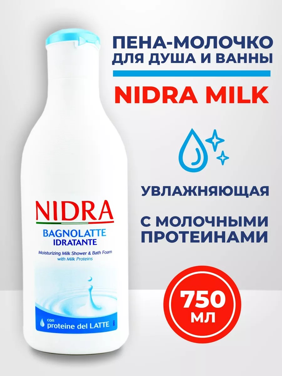 Nidra Пена-молочко для душа и ванны увлажняющая с молочными протеинами, 750 млКомпания Mirato S.p.A. является крупнейшим производителем средств личной гигиены и косметики из Италии. Компания имеет пятидесятилетний опыт и поставляет продукцию по всему миру. Линейка продуктов “Nidra“ является наиболее популярной и полюбившейся потребителям по всему миру. Ее главным преимуществом выступают натуральные протеины молока - широко известный в косметологии продукт, подтвердивший свою эффективность при клинических испытаниях и тестах. Благодаря большому содержанию активных аминокислот, пептидов и сахаридов молочные протеины дарят бережное увлажнение коже, питают ее и стимулируют обновление клеток. Молочные протеины в составе средств “Nidra” активизируют процессы синтеза коллагена, предупреждая преждевременное старение.