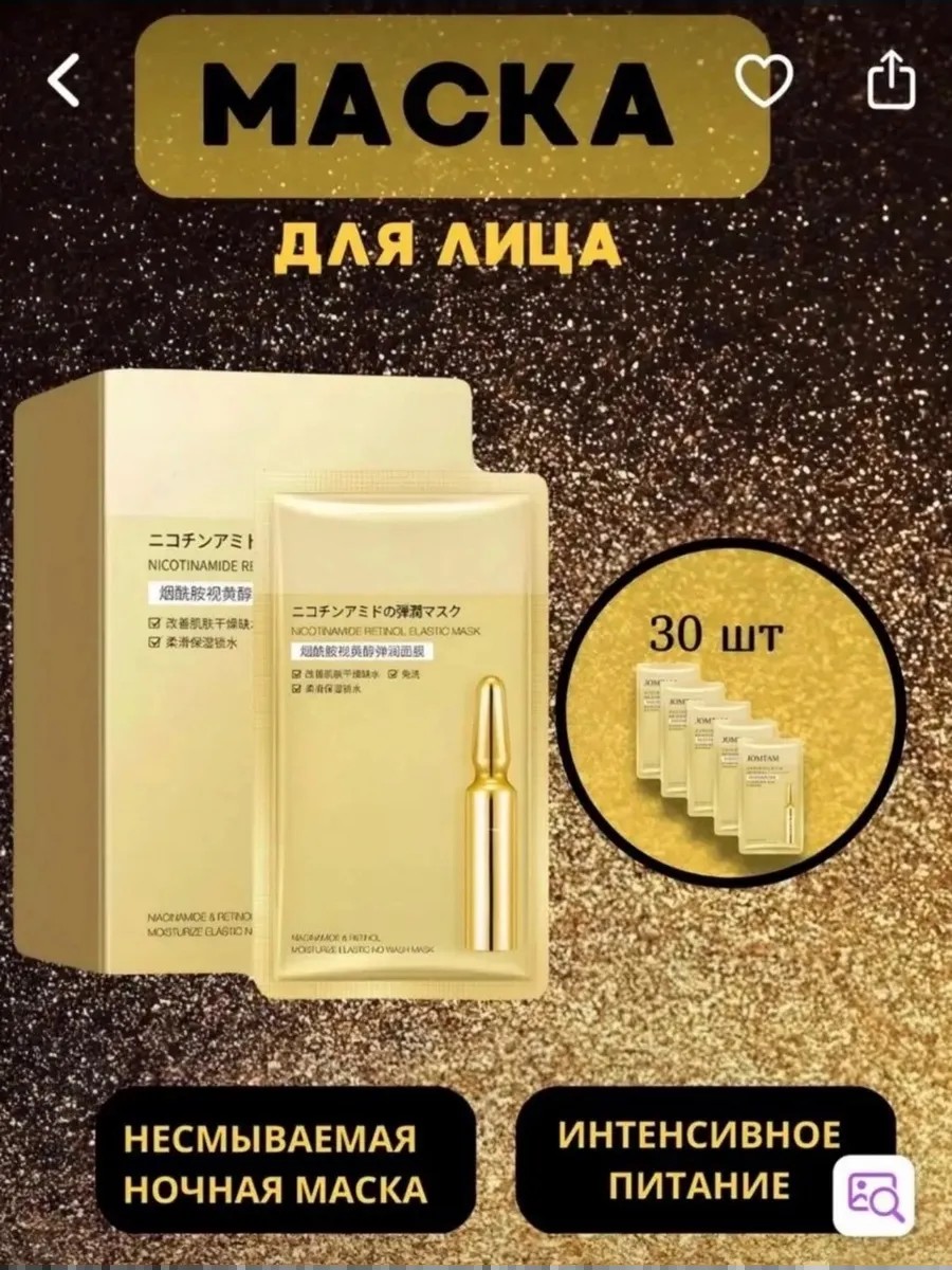 Ночная маска для лица в стиках это то, что нужно вашей коже при современном ритме жизни. Мгновенно освежающая маска для лица восстанавливает кожные покровы. Следы усталости и стресса исчезнут после первого же приминения ночная маска, а также справится последствиями недосыпа. Утром тебя ждет невероятный результат после использования ночной маски для лица: гладкая, подтянутая, сияющая кожа, к которой хочется прикасаться снова и снова. Преимущества маски для лица набор: приятная цена, хороший состав, удобно брать с собой, кожа чистая и отдохнувшая после первого применения. Омолаживающая маска глубоко увлажняет, выравнивает текстуру и цвет лица, рассасывает воспаления. Имеет накопительный эффект, так как содержит мощные антивозрастные компоненты. Коллоидное золото повышает упругость, насыщает кожу полезными веществами. Никотинамид поддерживает оптимальный баланс влаги, регулирует работу сальных желез, стимулирует синтез коллагена и эластина. Экстракт ласточкиного гнезда стимулирует кровообращение, успокаивает кожу и расслабляет ее, питает, снимает отечность. Экстракт женьшеня – мощный антиоксидант, эффективно действует против высыпаний, зуда, покраснений. Укрепляет стенки сосудов, предотвращает купероз и розацеа. Этому чуду средству маска для лица увлажняющая под силу все. Средство подходит для проблемной, сухой, комбинированной кожи. Идеально применять для регенерации эпидермиса после чисток лица, пилинга, скрабирования, умывания в хлорированной воде, поэтому её так любят косметологи и бьюти-блогеры. Может использоваться днем, перед нанесением базы под макияж, но мы рекомендуем оставлять маску на всю ночь. Удобно брать с собой в путешествия и использовать в качестве экспресс-маски в самолете при сильной сухости воздуха. В упаковке 30 штук по 4мл. Хватает на 2 раза по схеме только лицо или на 1 раз по схеме лицо-шея-декольте. Консистенция маски для лица корея не жидкая, гелеобразная, поэтому хватит 1-2 минуты для нанесения