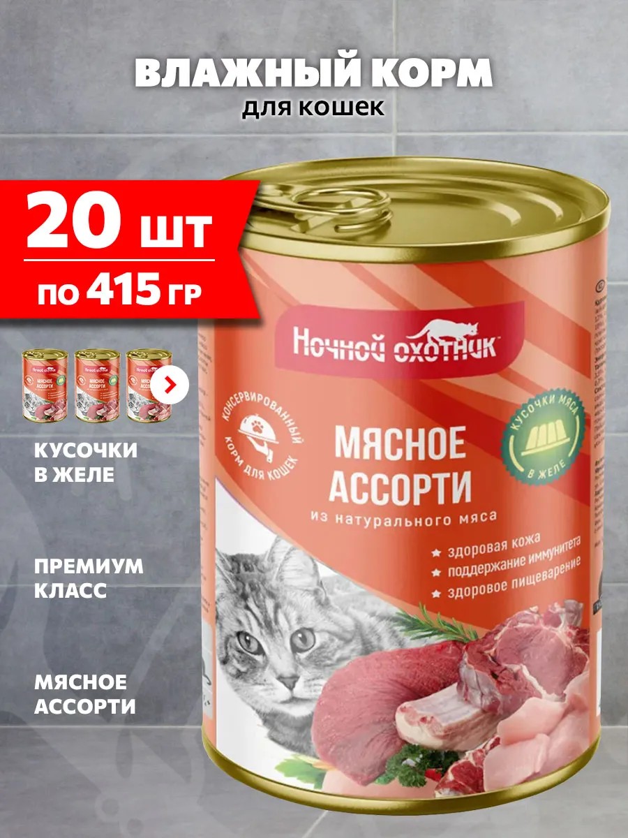 Ночной охотник Корм влажный для кошек мясное ассорти в желе 415 г 20 шт